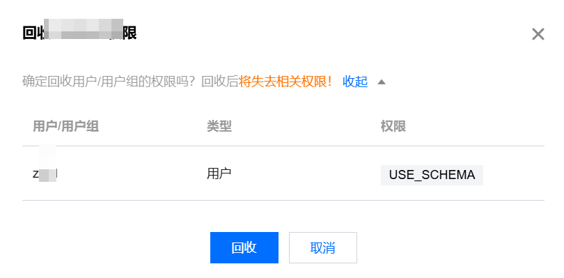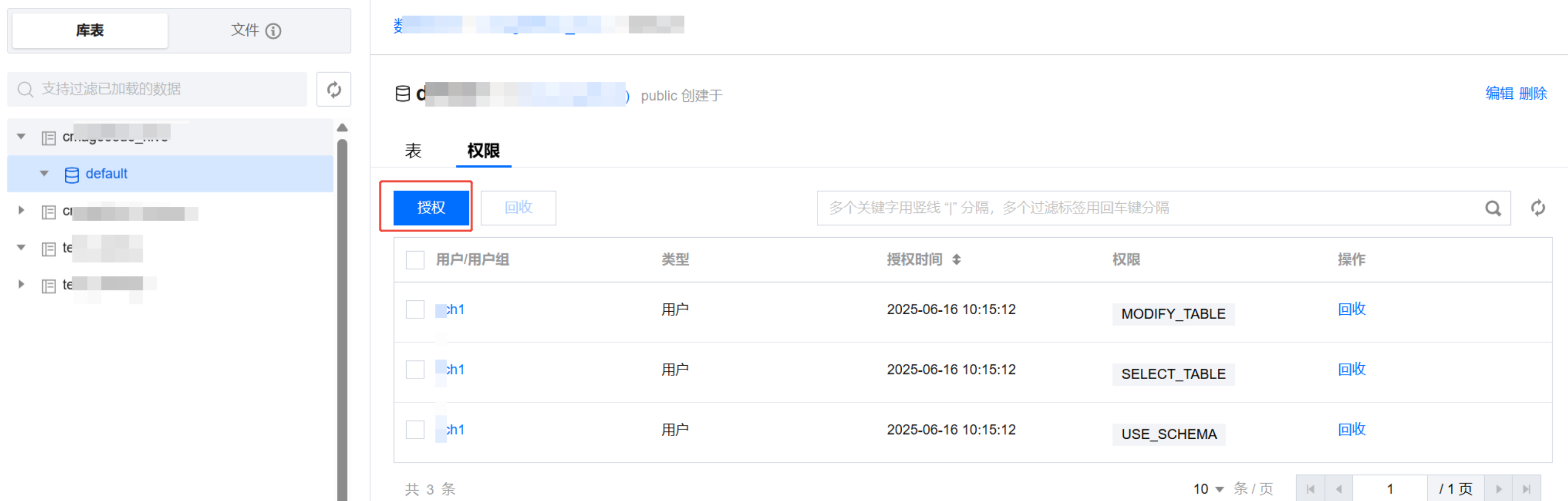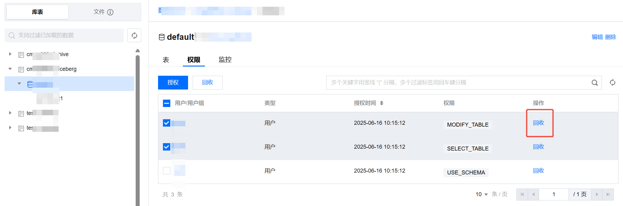 - 在授权记录中,选择需要回收权限的用户或用户组,点击“回收”。