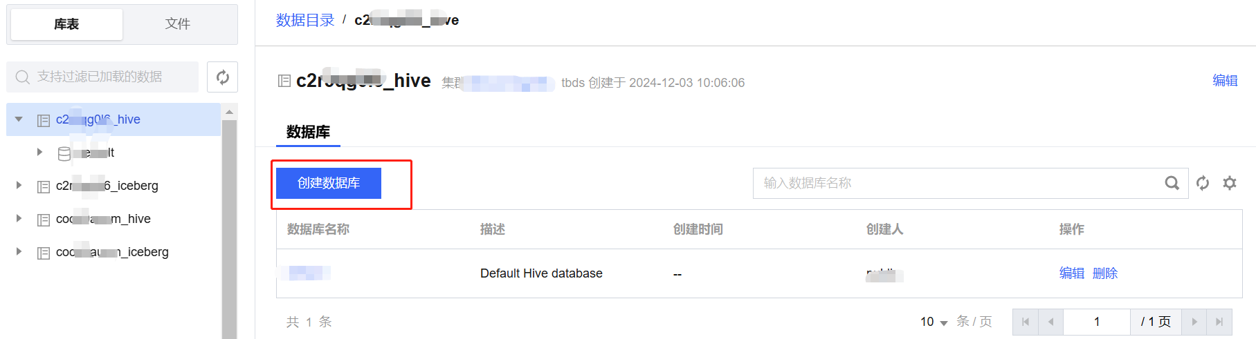 TBDS支持在数据管理页面完成数据库的创建、编辑和删除,方便用户对平台上的数据库进行便捷管理。