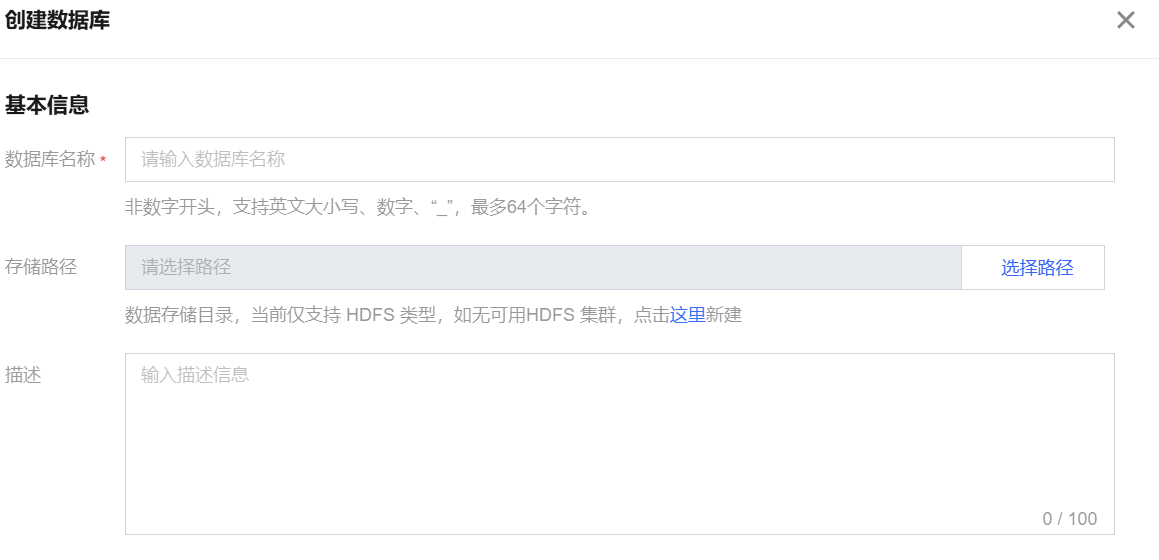 信息 详情 数据库名称 必填,数据目录下不允许存在重名的数据库 存储路径 可选,默认为/usr/hive/warehouse,可通过修改Hive的hive.metastore.warehouse.dir配置值来调整。 描述 可选,库描述,不超过100个字符 创建完成后可在列表中查看。