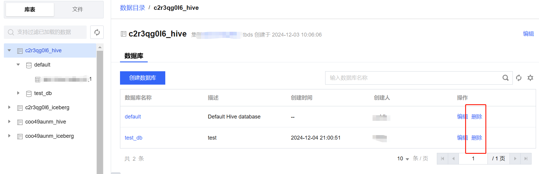 - 在数据管理-库表下选定数据目录,在右侧数据库列表中选择需要删除的数据库并点击“删除”,当数据库下存在表时不允许删除。