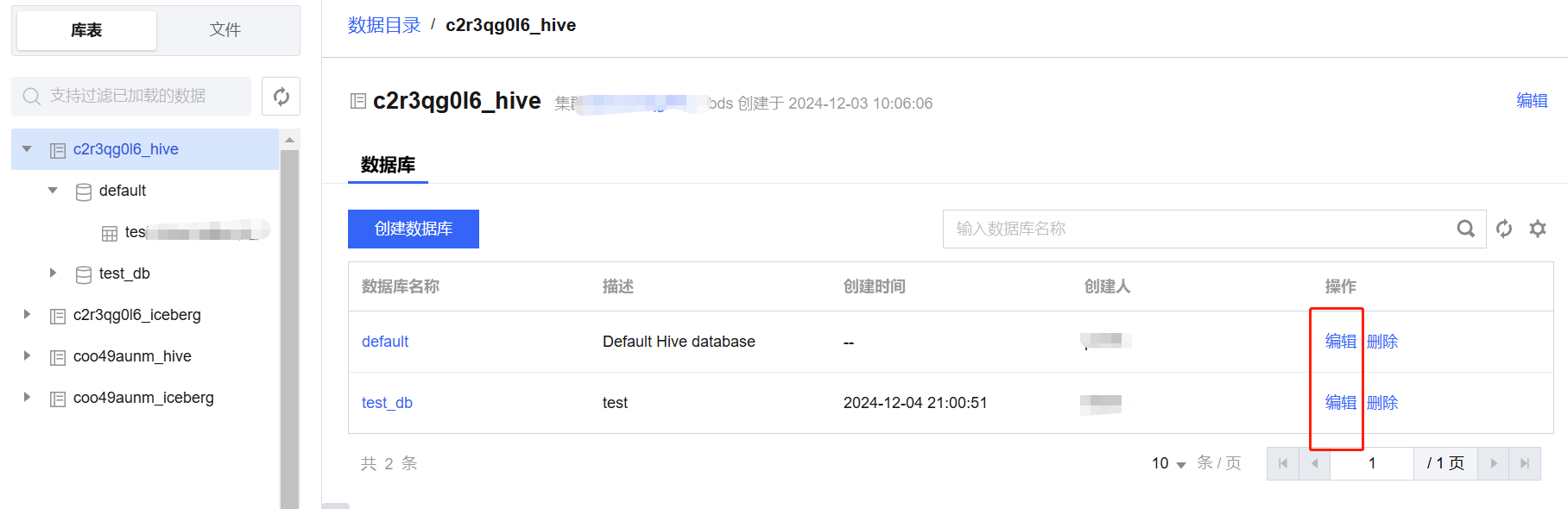 - 在数据管理-库表下选定数据目录,在右侧数据库列表中选择需要编辑的数据库并点击“编辑”,仅支持编辑库描述。