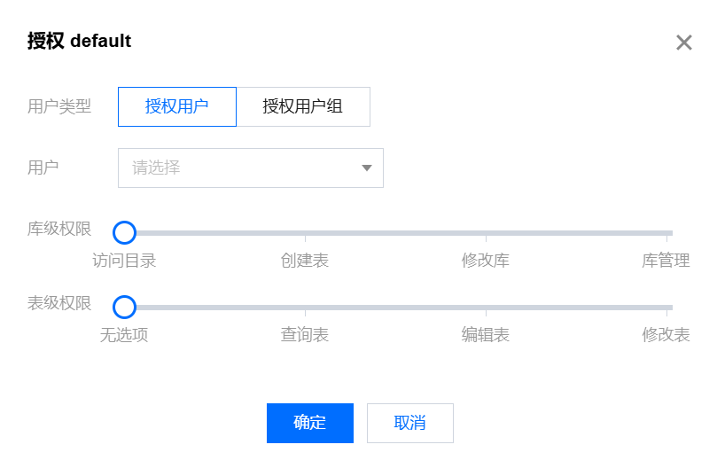- 在授权弹框中选择需要授权的用户/用户组和权限,然后点击确认完成授权操作。