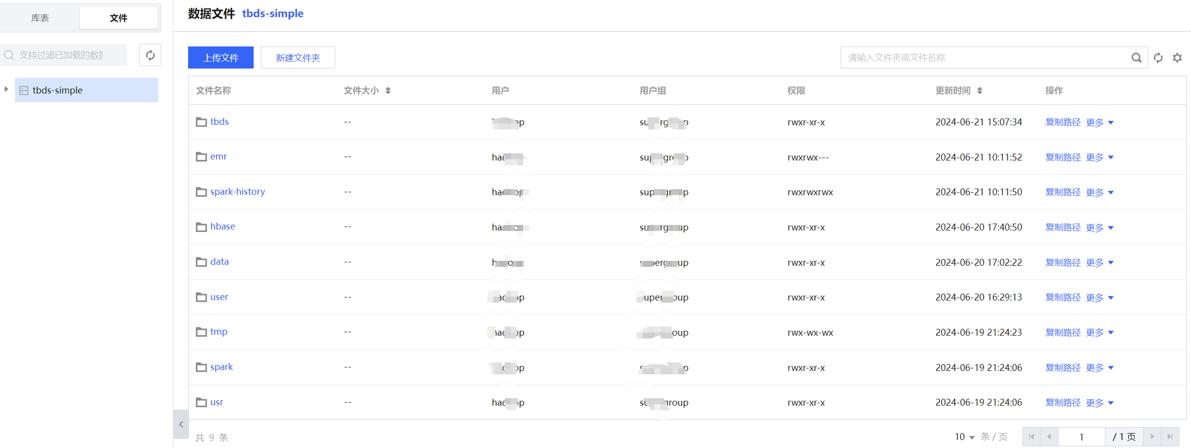 以管理员用户登录 TBDS,进入 TBDS Manager 首页 > 数据管理,左侧点击“文件”切换到文件管理视图: