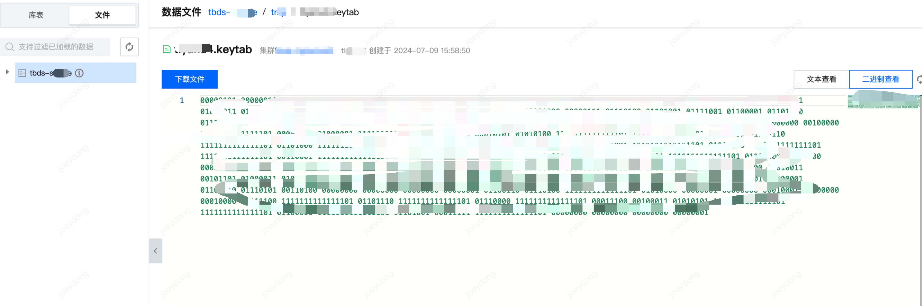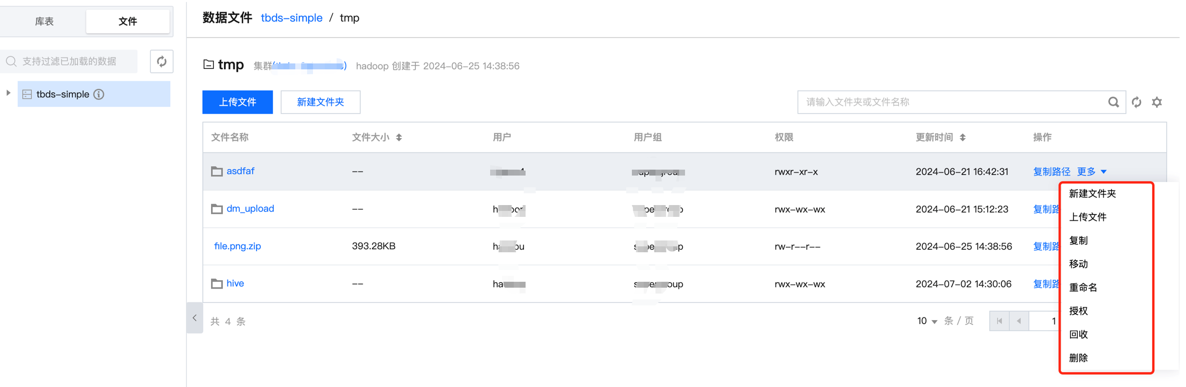 操作名称 描述 复制路径 复制文件或文件夹的全路径 新建文件夹 在当前文件夹下新建子文件夹 上传文件 将本地文件上传到 HDFS 目录下,上传文件大小最大支持 100MB 复制 将选中的文件或文件夹复制到其他目录下 移动 将选中的文件或文件夹移动到其他目录下 重命名 更改文件或文件夹的名称 授权 为用户授予访问权限(基于 Ranger ) 回收 回收用户访问权限(基于 Ranger ) 删除 删除文件或文件夹,当 HDFS 开启回收站时会删除到回收站。 文件管理:点击左侧文件,右侧将展示文件预览信息,支持按照文本和二进制查看。