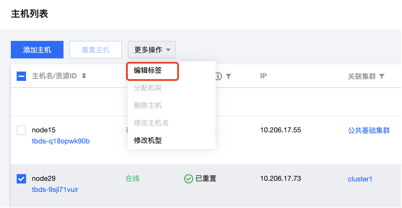 以管理员用户登录 TBDS,进入 TBDS Manager首页 > 主机列表,选中目标主机后点击【更多操作】->【编辑标签】。
