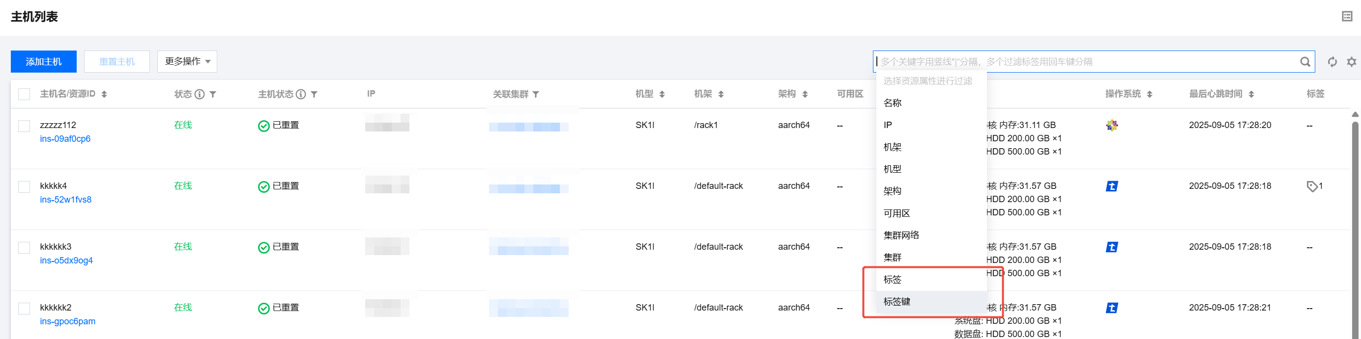 为主机设置完成标签后,支持按照标签和标签键筛选。