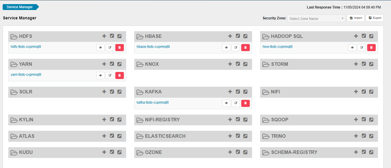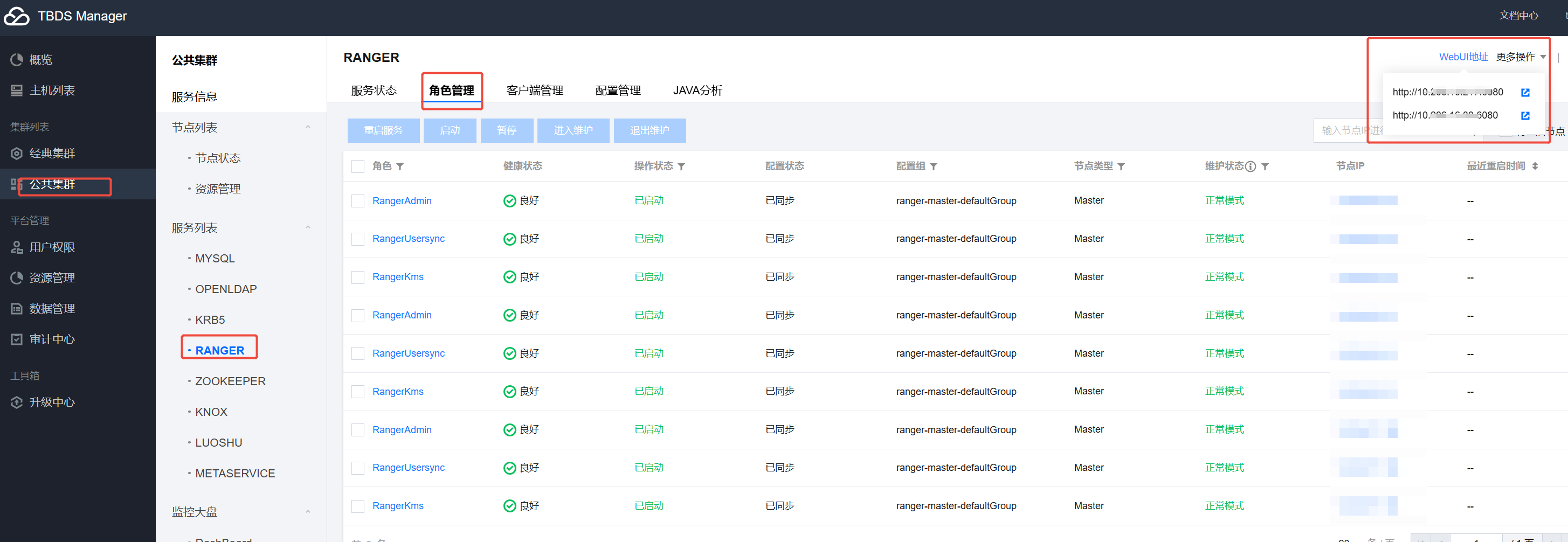 进入 TBDS Manager 首页 > 公共集群 > 服务列表,单击 Ranger 组件,在页面右上方单击webui。