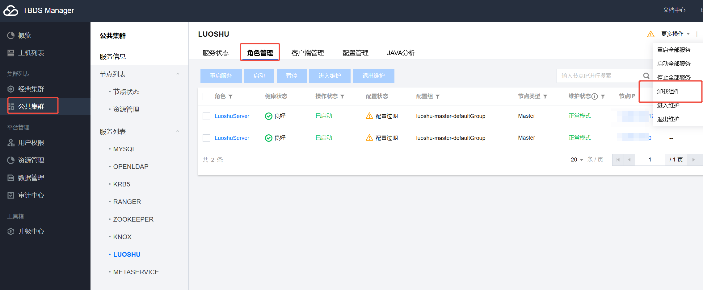 - 登录 TBDS 控制台,进入公共集群->服务列表 -> 服务X -> 角色管理 -> 更多操作,点击“卸载组件”。