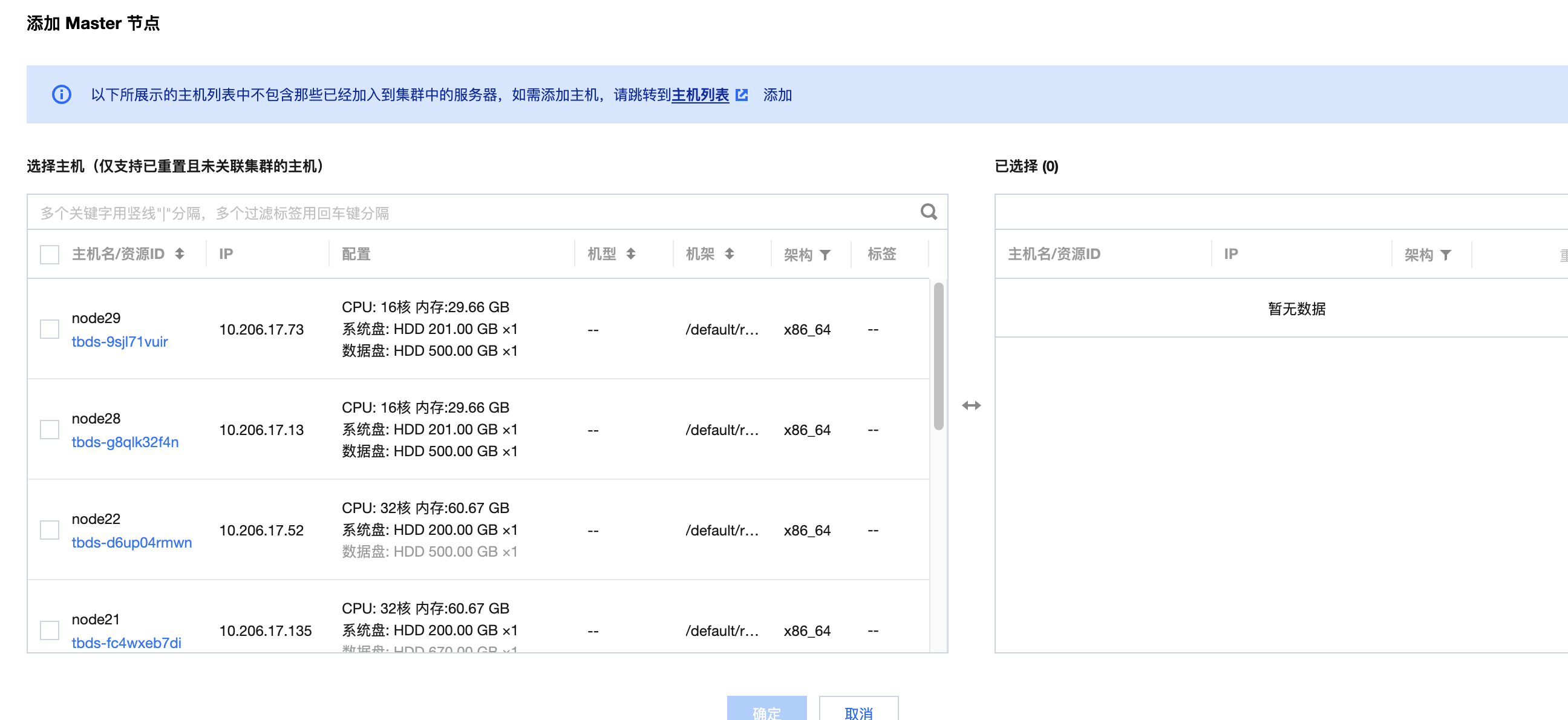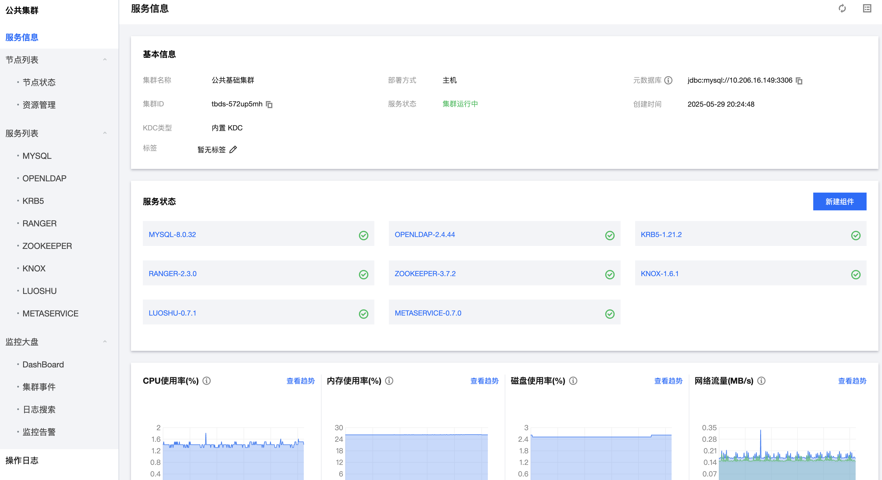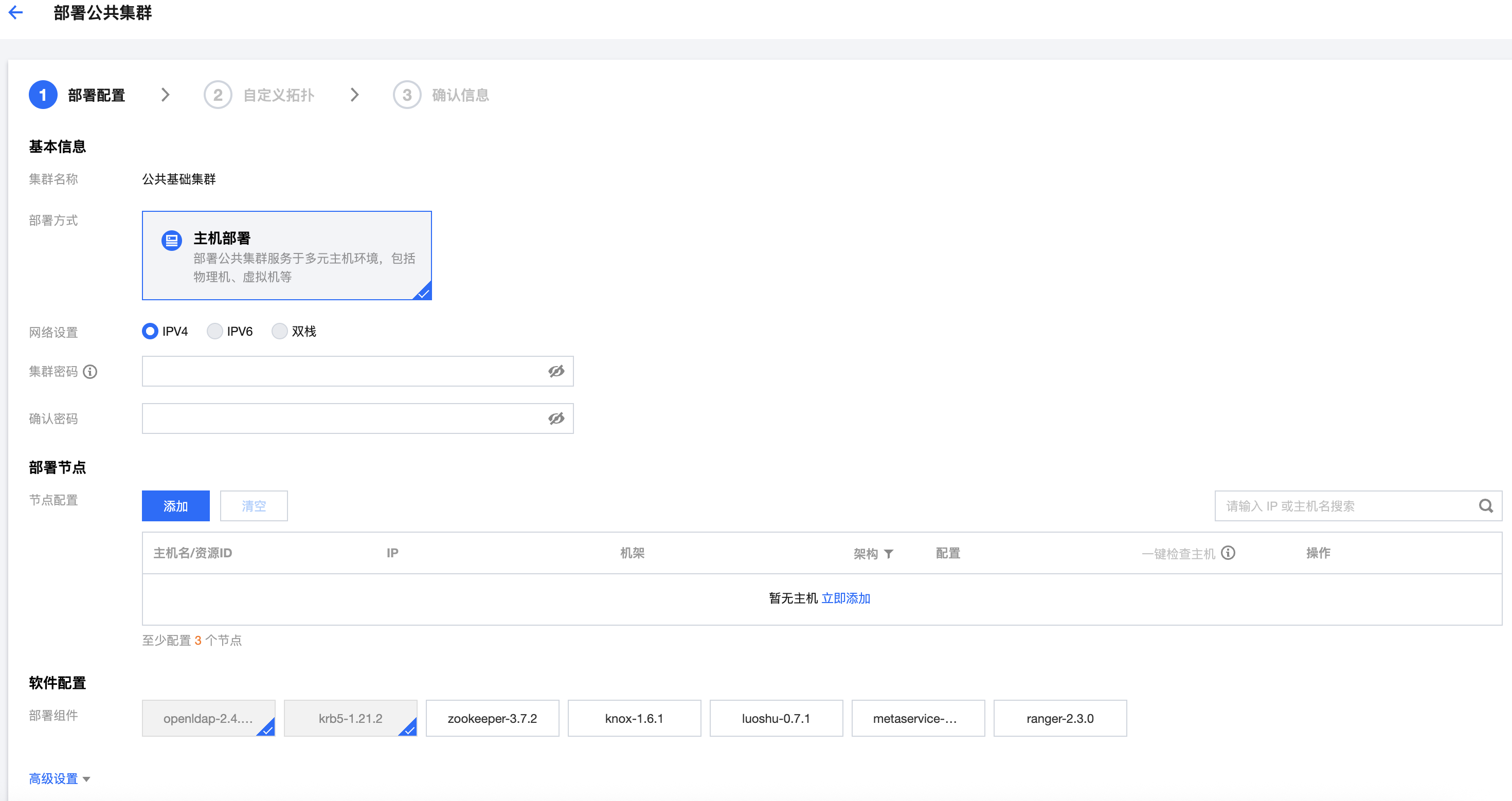 TBDS Manager 完成安装后需要先部署公共集群,一个主账号仅包含一个公共集群。在安装公共集群时,系统会默认启用内置的KDC服务。公共集群支持按照主机形态部署: