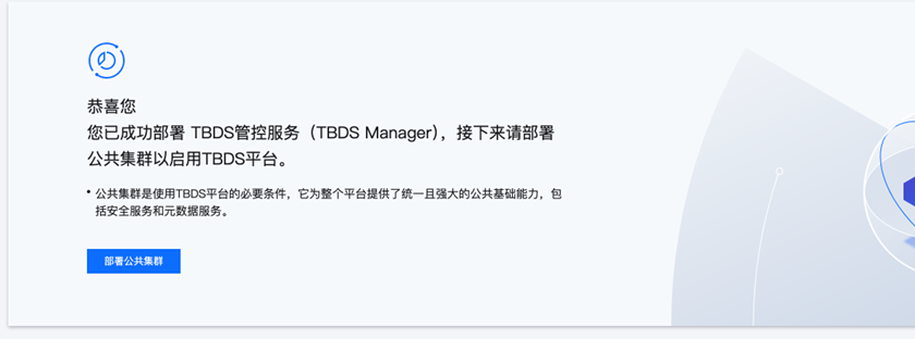 安装完成 TBDS Manager 后,首次登录 TBDS 后可以看到如下公共集群部署引导页面。