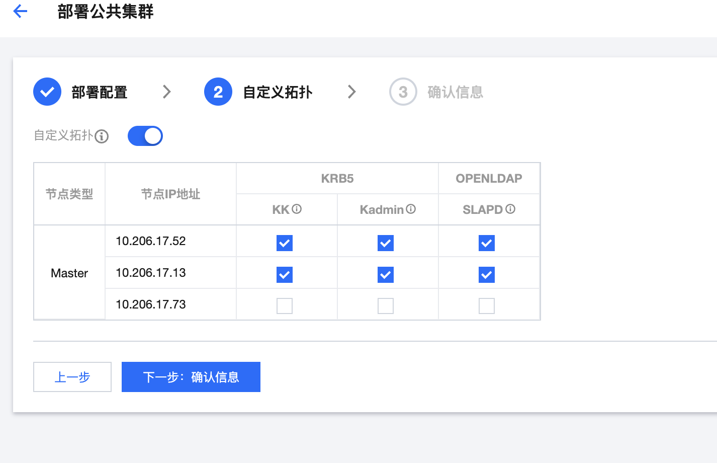 配置项说明如下:公共集群服务组件默认按照所选主机自动配置。如需调整,可开启自定义拓扑开关进行手动配置。