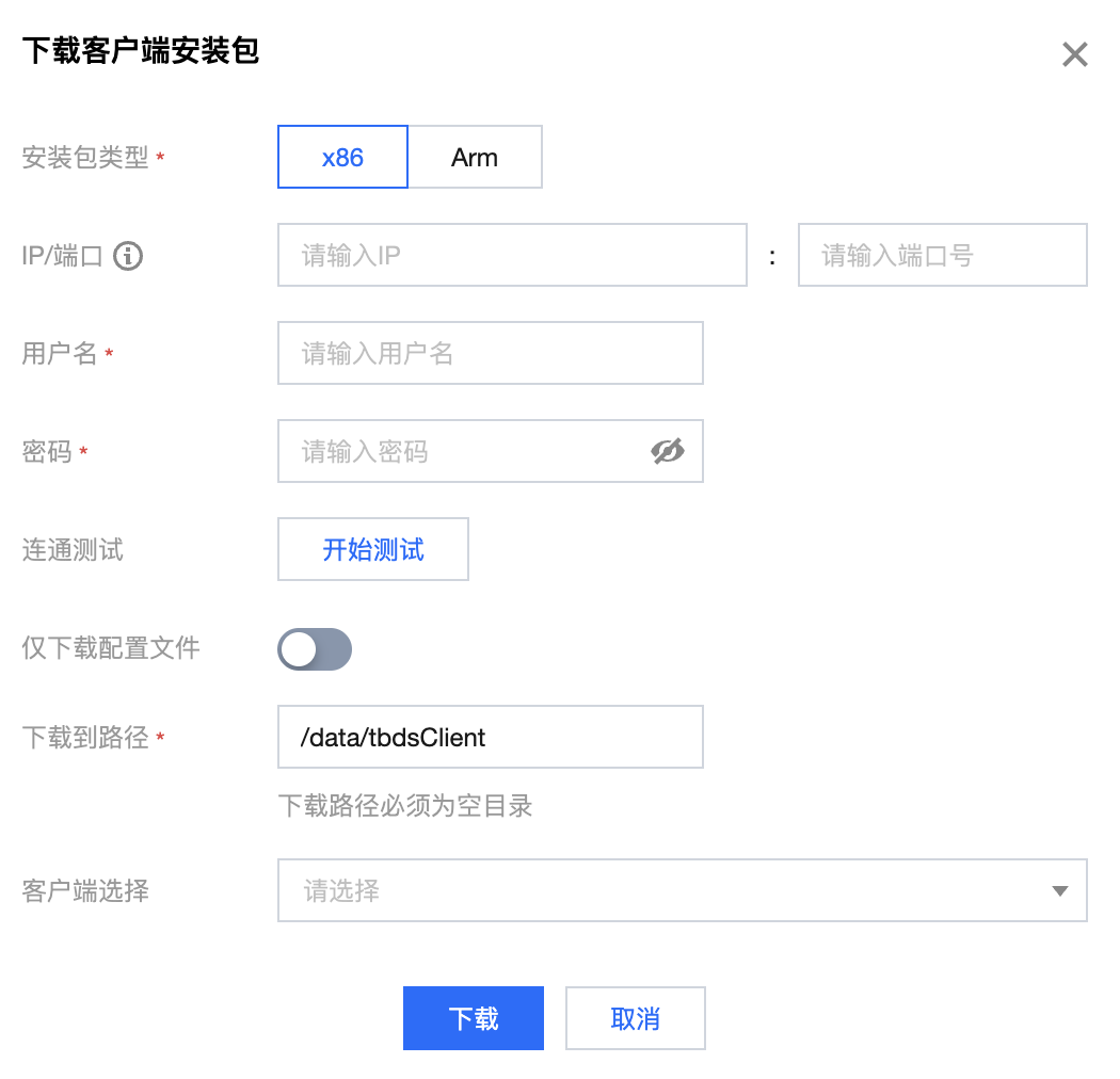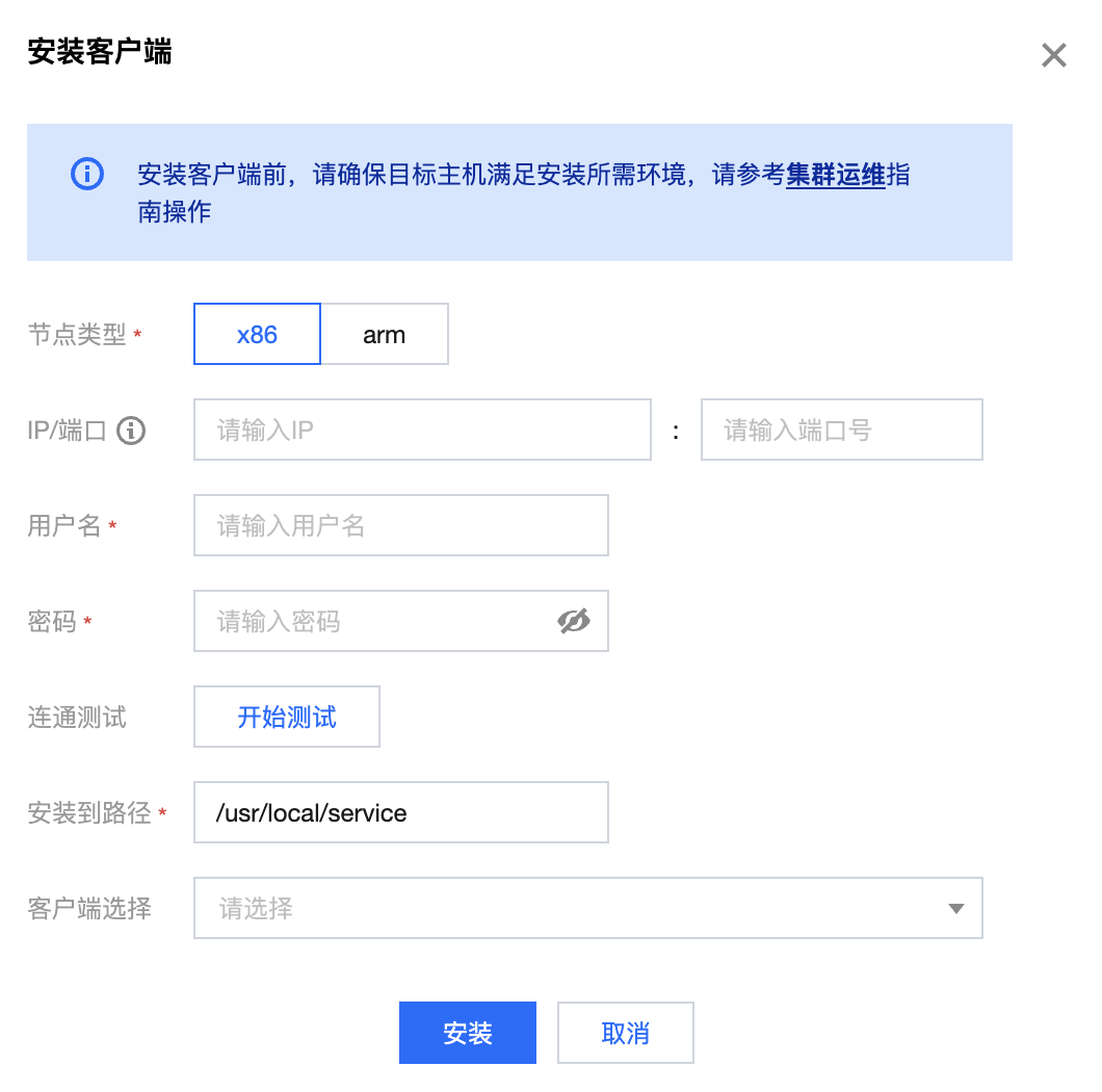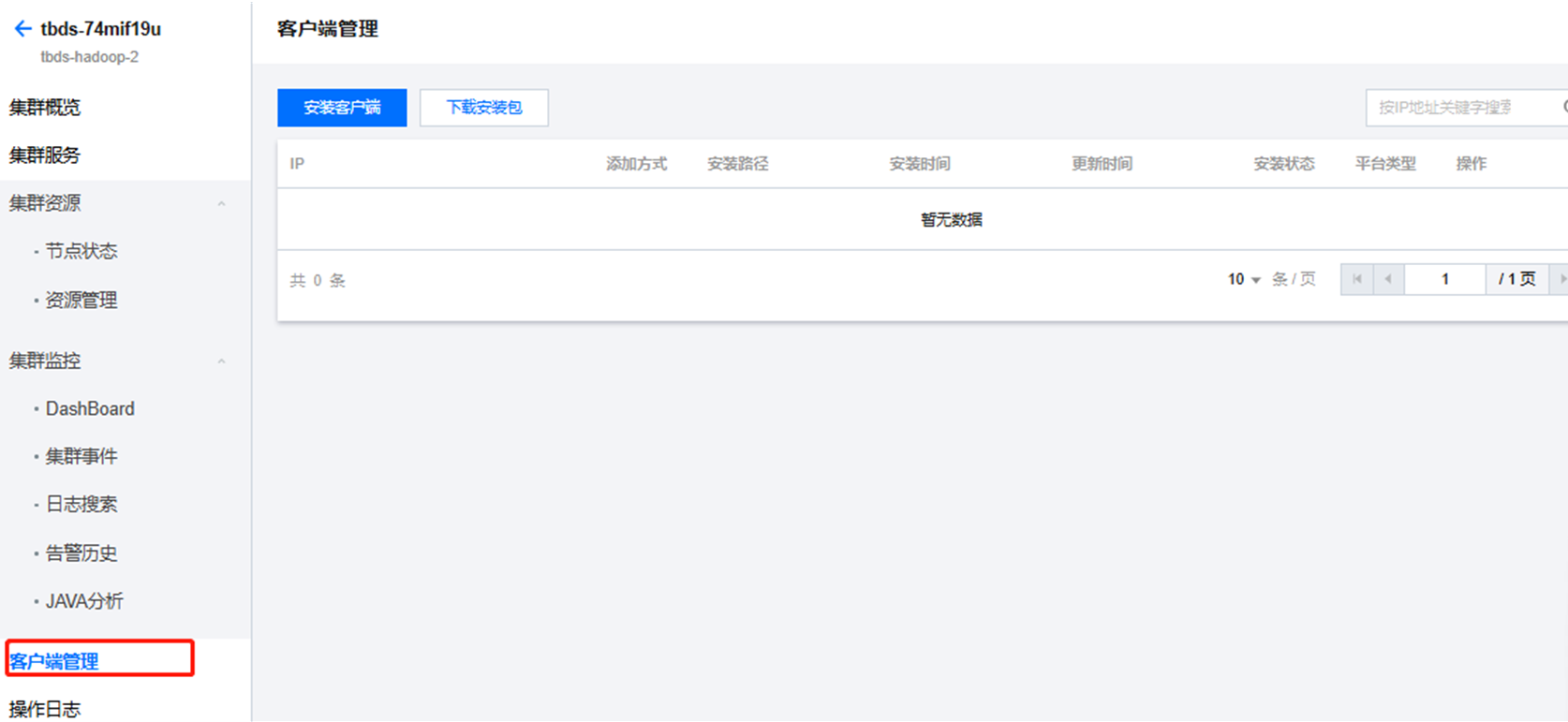 客户端管理提供了集群外部的远程客户端安装信息,包括 IP、添加方式、安装路径、安装时间、更新时间、安装状态、平台类型信息,同时支持集群内安装包的下载和集群外客户端的安装。