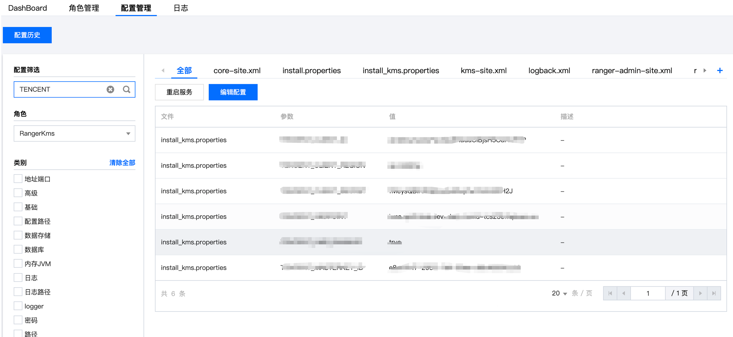 install_kms.properties。TENCENT_KMS_ENABLED=true TENCENT_MASTERKEY_ID=第三步获取的ID TENCENT_CLIENT_ID=第二步获取的SecretId TENCENT_CLIENT_SECRET=第二步获取的SecretKey TENCENT_CLIENT_REGION=没用到,不用管 TENCENT_ENDPOINT=kms.api3.auto-deploy.tcs-master.fsphere.cn # 后四段后缀随环境变化