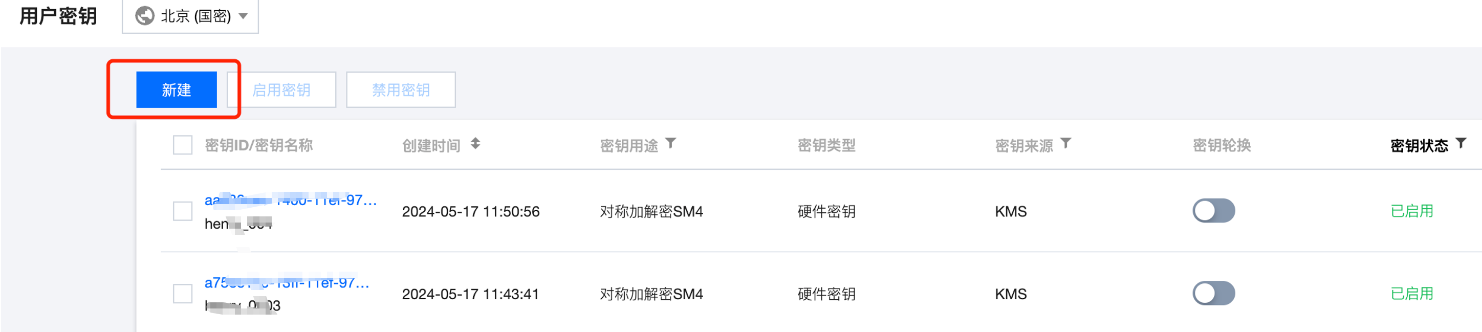 点击左侧导航栏用户密钥,进入用户密钥界面。密钥管理员可通过此界面创建和管理密钥信息。