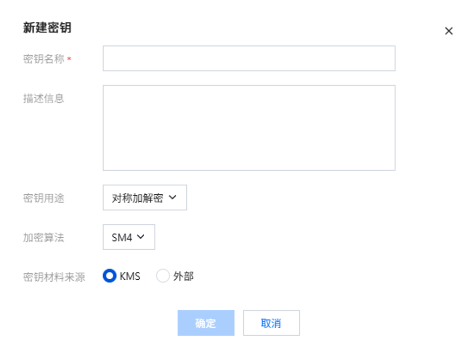 当密钥用途为对称加解密时,加密算法不可选,默认大陆地区为 SM4,其他地区为 AES_256 。密钥材料来源 必选;选择密钥生成方式,KMS 生成或者用户自有密钥导入。 注意: