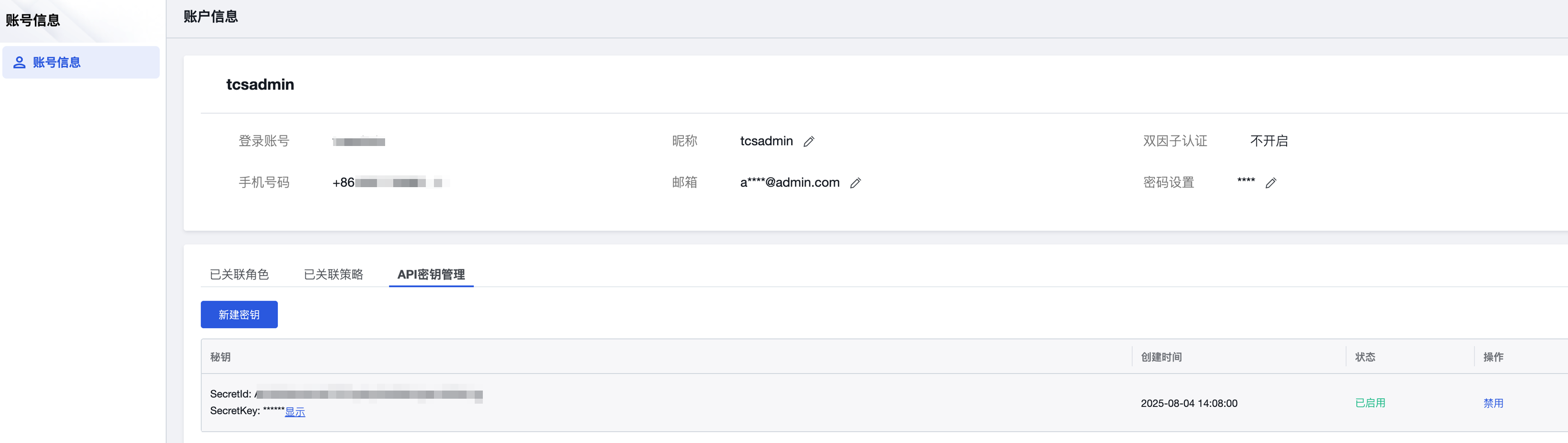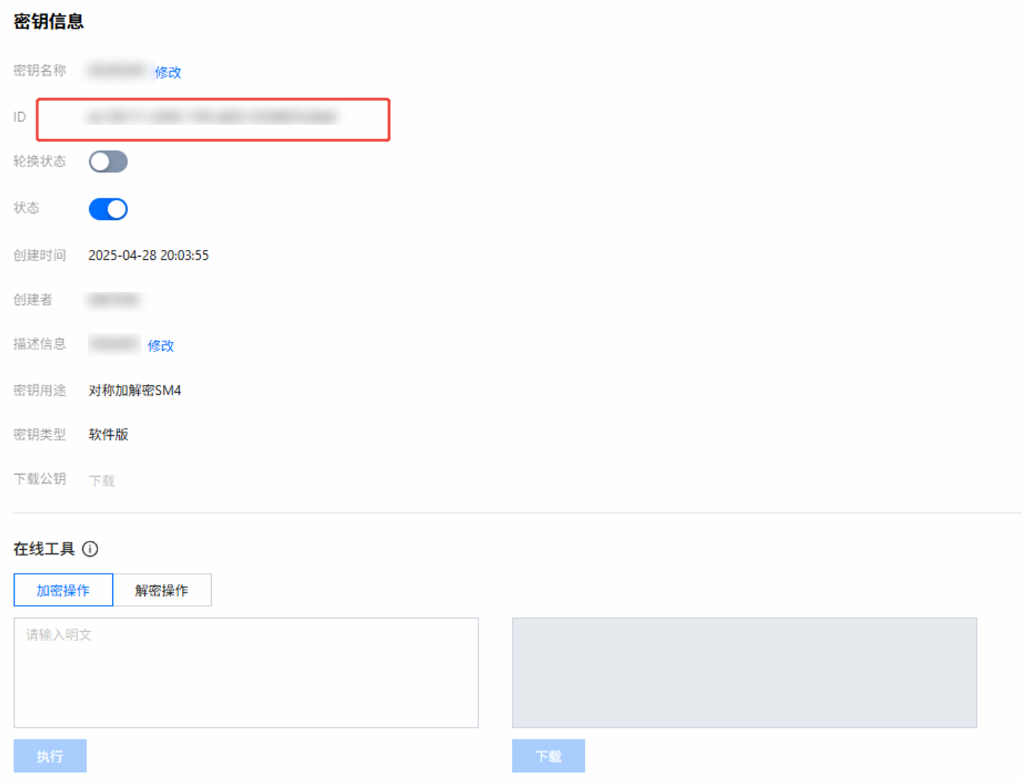 记录下 SecretId 和 SecretKey。用密钥管理员账号登录密钥管理系统,创建 KMS 主密钥,系统登录网址:http://{IP}:{port}/web/。