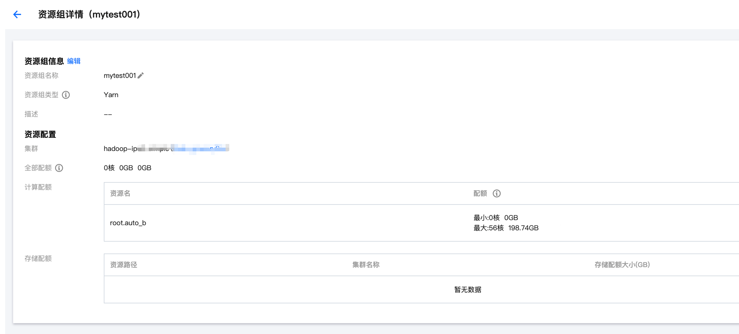信息 详情 资源组名称 支持名称重复,长度限制为4-36个字符,只允许包含中文、字母、数字-_()。 资源组类型 支持 YARN 计算资源。 描述 资源组描述。 选择集群 选择需要分配资源的经典集群,该集群需要包含 YARN 组件。 计算配额 通过将 YARN 的队列绑定到该资源组下实现计算配额的分配,其中 YARN 的计算配额根据 YARN 队列的配置进行计算。在 Fair 调度模式下,最小值取自 minResource,最大值取自 maxResource。而在 Capacity 调度模式下,最小值取自 Effective Capacity,最大值则取自 Effective Max Capacity。 存储配额 通过将该经典集群的 HDFS 存储路径绑定到该资源组下实现存储配额的分配,支持设置存储路径的存储配额大小。 存储配额大小(GB) 表示当前存储路径所允许的最大存储容量,并受集群整体配额的限制。请注意,多路径的配额总和有可能超出集群的最大配额,如存储超过配额则会阻断数据写入。 填写完成后点右侧新建资源组完成资源组创建: