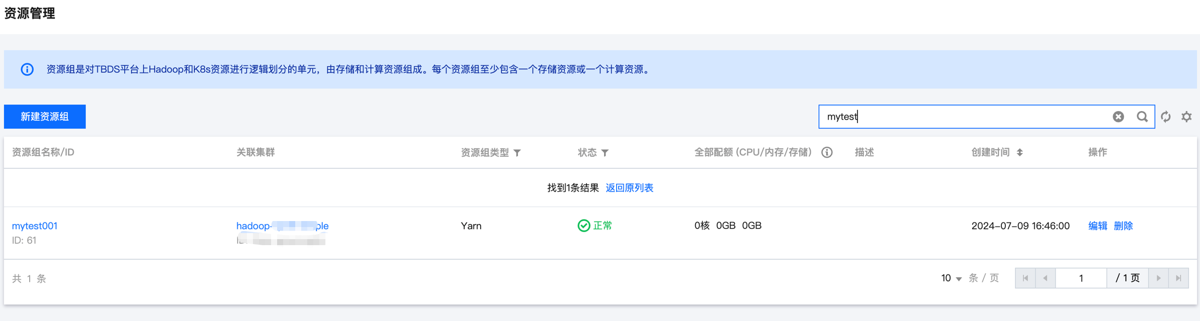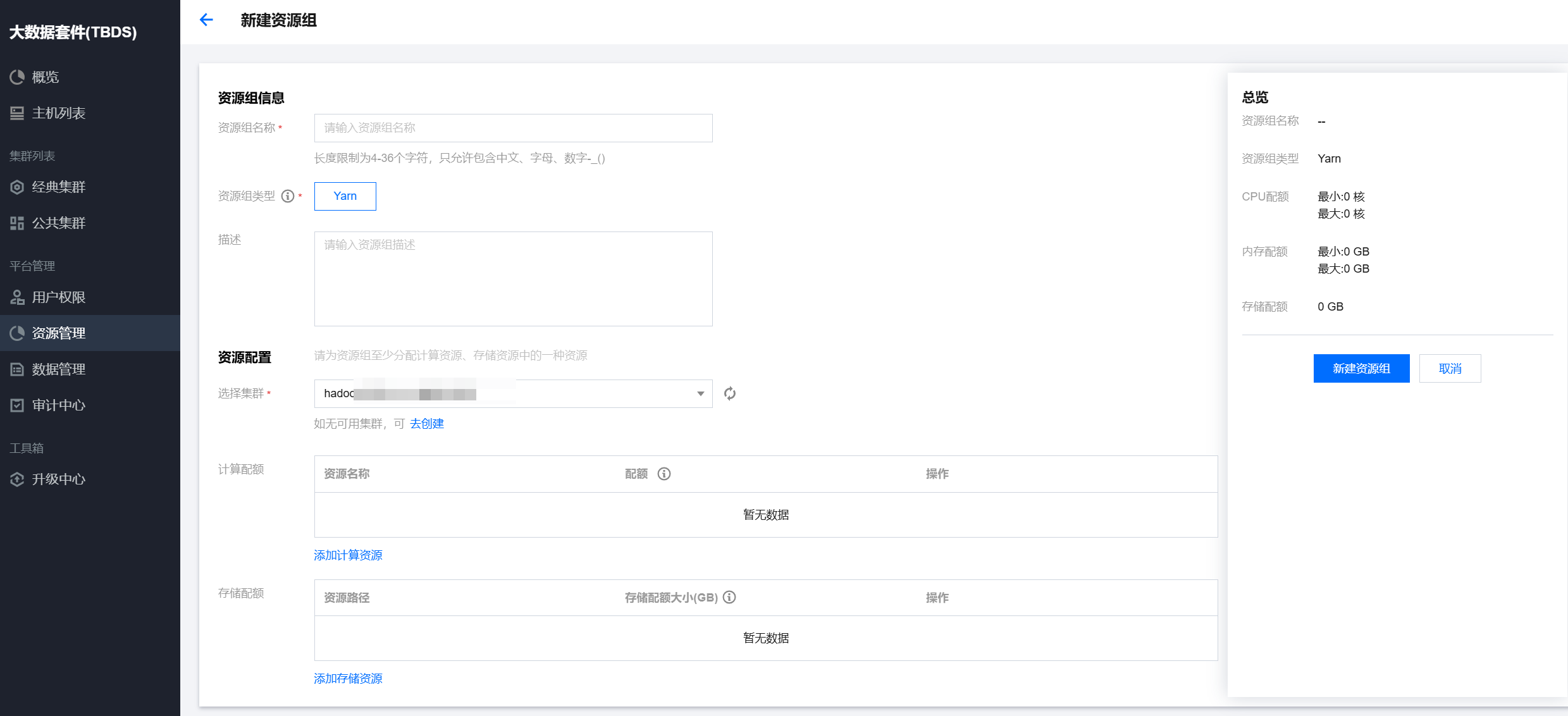以管理员用户登录 TBDS,进入 TBDS Manager 首页 > 资源管理,点击新建资源组,按照要求填写信息并确认: