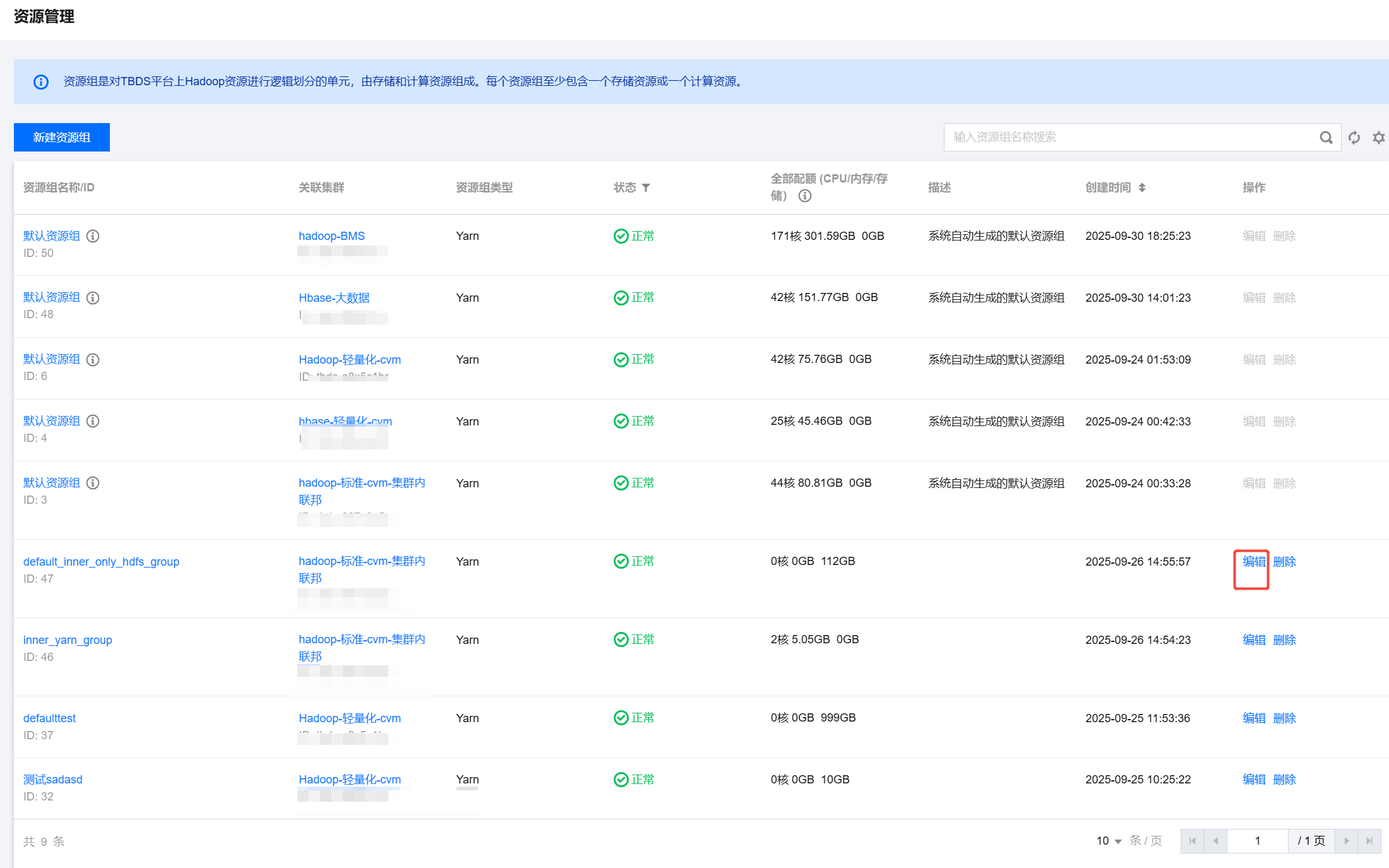 以管理员用户登录 TBDS,进入 TBDS Manager 首页 > 资源管理,在资源组列表中找到需要编辑的资源组,在操作中单击编辑。