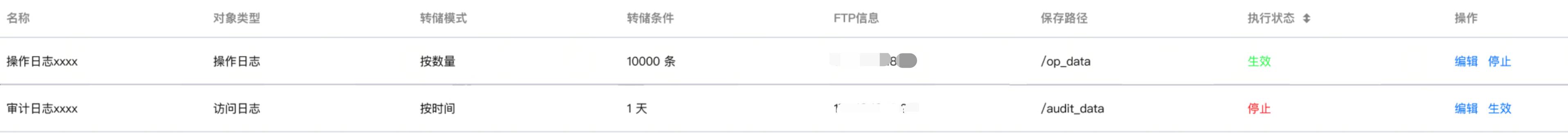 新建成功后会显示在转储列表中,可以对执行状态进行操作,点击“停止”、“生效”让转储动作进行暂停和启动。说明: