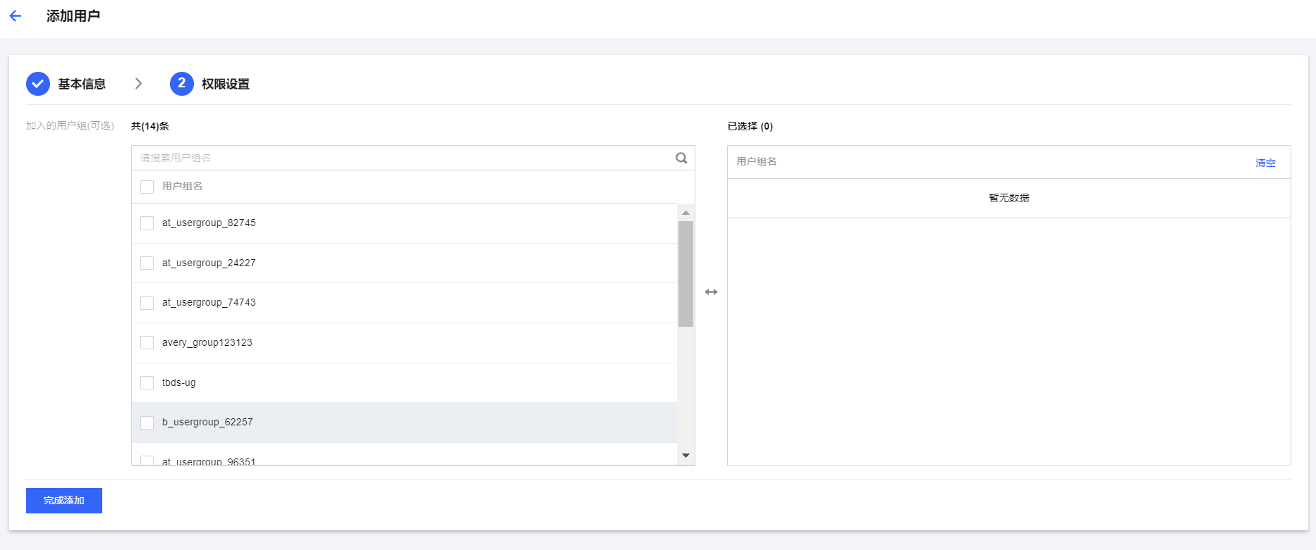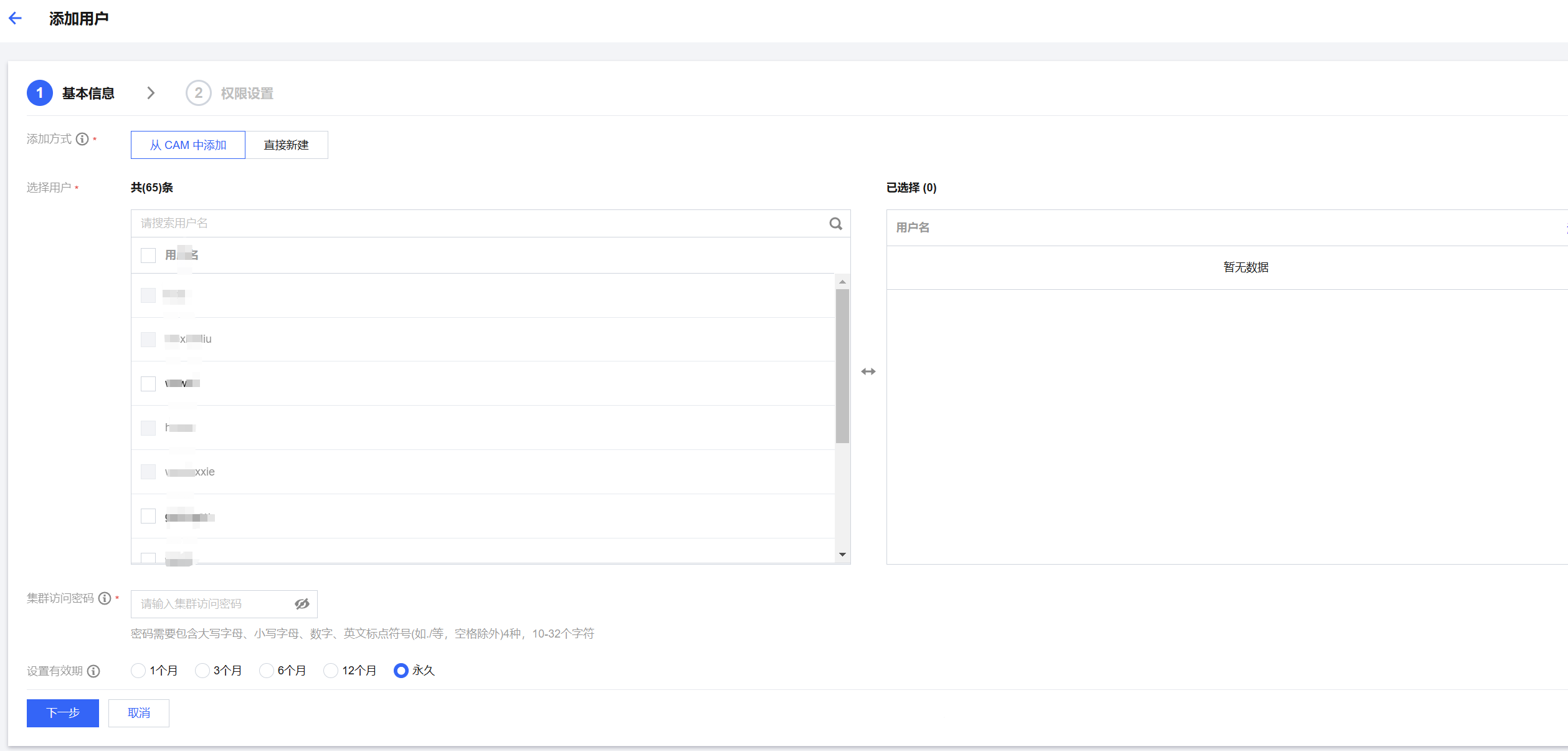 2. TBDS 支持“从 CAM 中添加”和“直接新建”两种添加用户的方式,这里选择“从 CAM 中添加”,表示将 CAM 用户添加为 TBDS 用户,添加后将有权限操作 TBDS 资源。集群访问密码是用户提交任务时的密码,这里需要按要求填写。认证有效期默认为永久,有效期内用户可以访问 TBDS,如需要持续访问大数据服务,请务必在有效期结束前更新认证时间,然后点击下一步进入权限配置。
