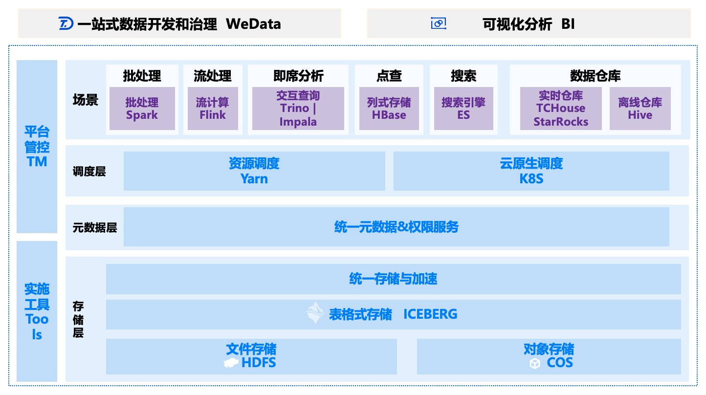 同时TBDS底座可以和数据开发治理平台WeData、BI进行对接。 - WeData包含数据集成/开发/测试/运维的全链路DataOps数据开发能力,以及数据建模/质量/安全/资产/服务等一系列数据管理和治理能力,产品方案符合研发运营一体化设计思路;