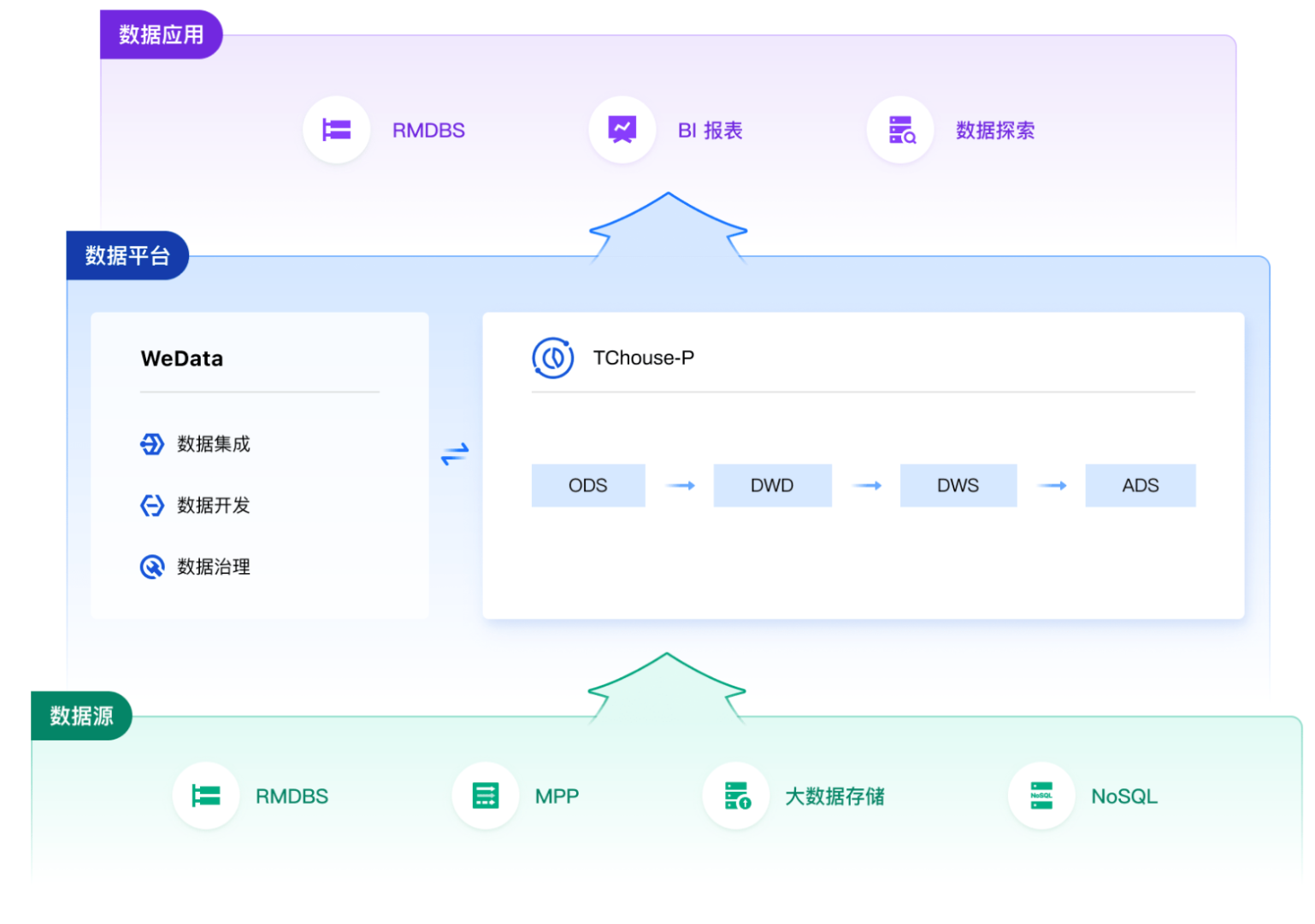 **需求场景:**OLAP数仓分析场景,主要面向政府企业,在数据统一汇聚的基础上,希望深度挖掘数据价值,通过建设数仓,以数据可视化和数据应用的方式赋能业务,TCHouse提供数仓开发处理、分层建模,搭配海量数据查询引擎,提升海量数据查询性能,满足实时/在线数据分析的需要 。