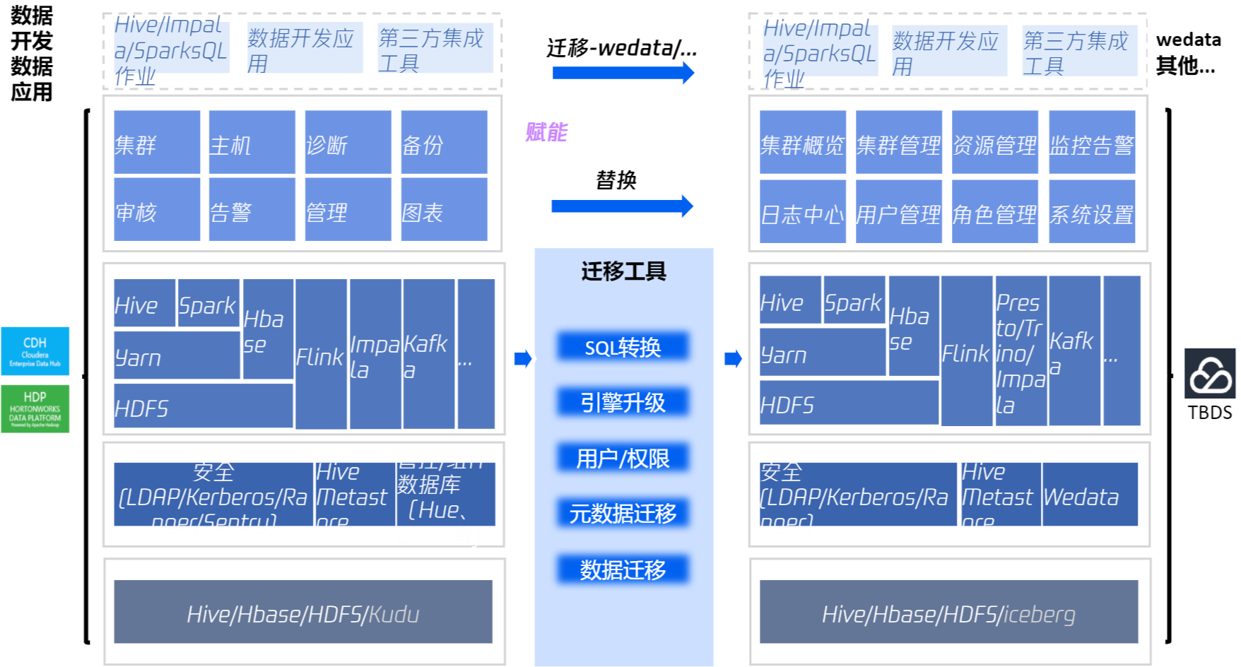 产品优势:【平滑适配】TBDS开源兼容自主创新,能无缝对接CDH开源hadoop生态;【端到端产品】提供了一套CDH平滑迁移标准产品服务,包括组件迁移、数据迁移、工作流业务迁移方案;【高效可靠】同时考虑了迁移效率、准确性、容错性、自动化能力,迁移效率提升80%,全链路数据校验,准确性达99%。