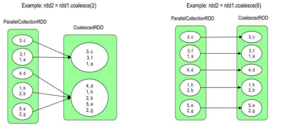 两者均是将 RDD 中的数据进行重新分区,repartition(numPartitions) 语义与 coalesce(numPartitions, true) 一致(第二个参数表示是否 shuffle),即 repartition 一定会进行 shuffle。而 coalesce 将相邻的分区直接合并在一起,形成的数据依赖关系是多对一的窄依赖,不会触发数据的 shuffle。因此在不进行 shuffle 的情况下,coalesce 不能将一个分区拆分为多份,且当 RDD 中不同分区中的数据量差别较大时,直接合并容易造成数据倾斜。为了增加分区或解决数据倾斜问题,可以指定 shuffle=true 将数据打乱。