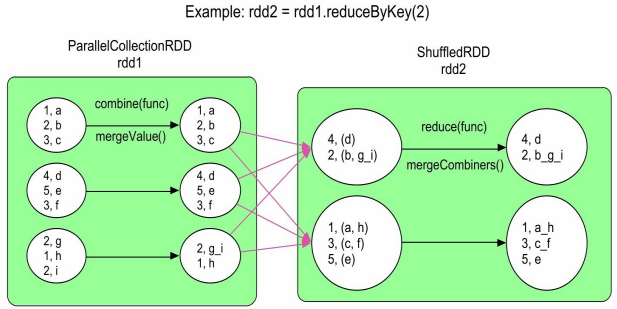 与 groupByKey 不同,reduceByKey(func, numPartitions) 实际包含两步聚合。第一步,在 Shuffle 之前对每个分区的数据进行一个本地化的 combine() 聚合操作,也称为mini-reduce 或 map 端 combine,这一步由 Spark 自动完成,并不形成新的 RDD,减少了数据传输量和内存用量,效率比 groupByKey 高。第二步,reduceByKey 生成新的 ShuffledRDD,将来自不同分区且具有相同 key 的数据聚合在一起,利用 func 进行 reduce() 聚合操作。整个过程中,combine() 和reduce() 的计算逻辑一样,采用同一个 func。