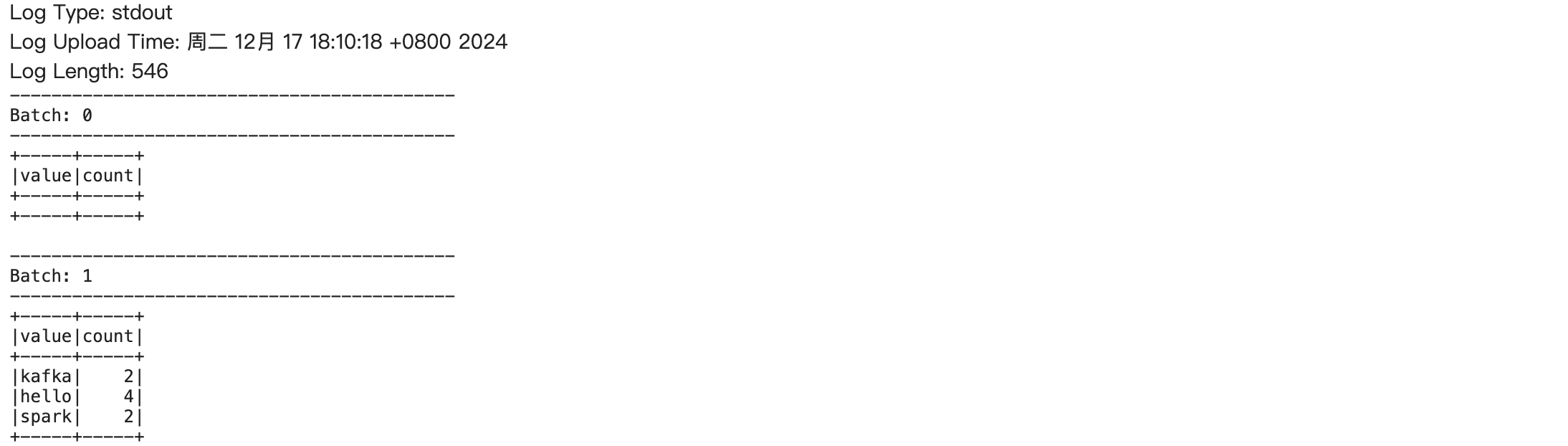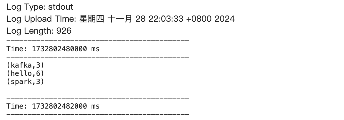 - YARN UI 页面根据 ApplicationID、User、Name 等信息,查看对应的 Spark 任务日志。可以看到,任务日志中有输出单词统计相关信息,如下图所示。
