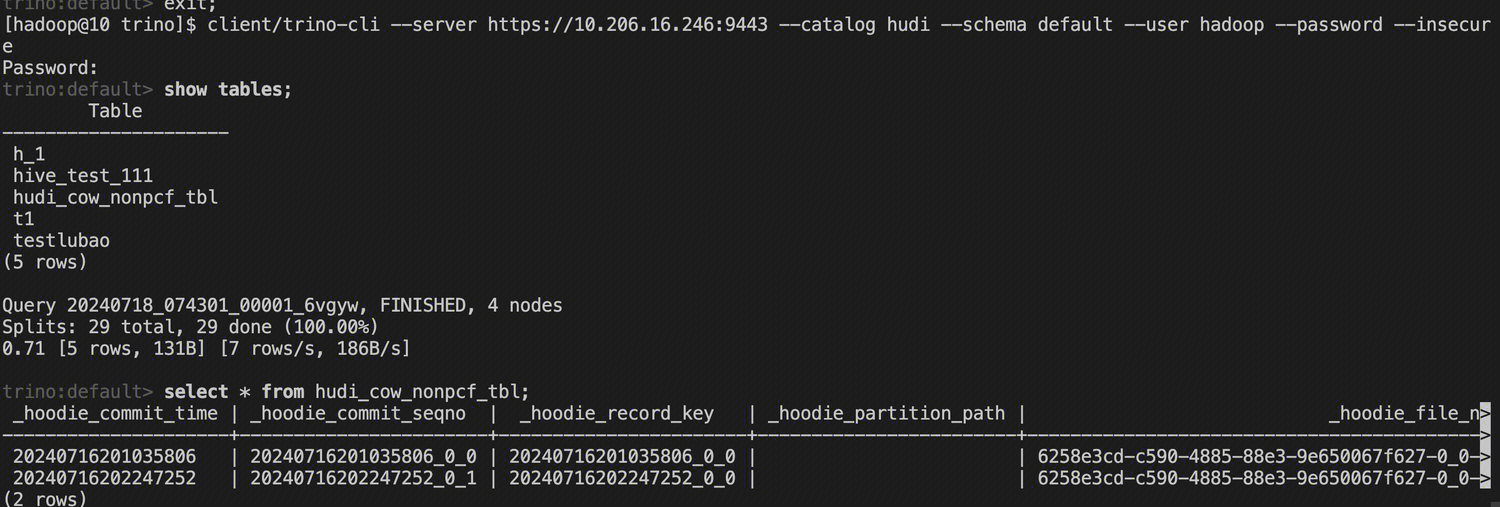 client/trino-cli --server https://10.206.16.246:9443 --catalog hudi --schema default --user hadoop --password --insecure