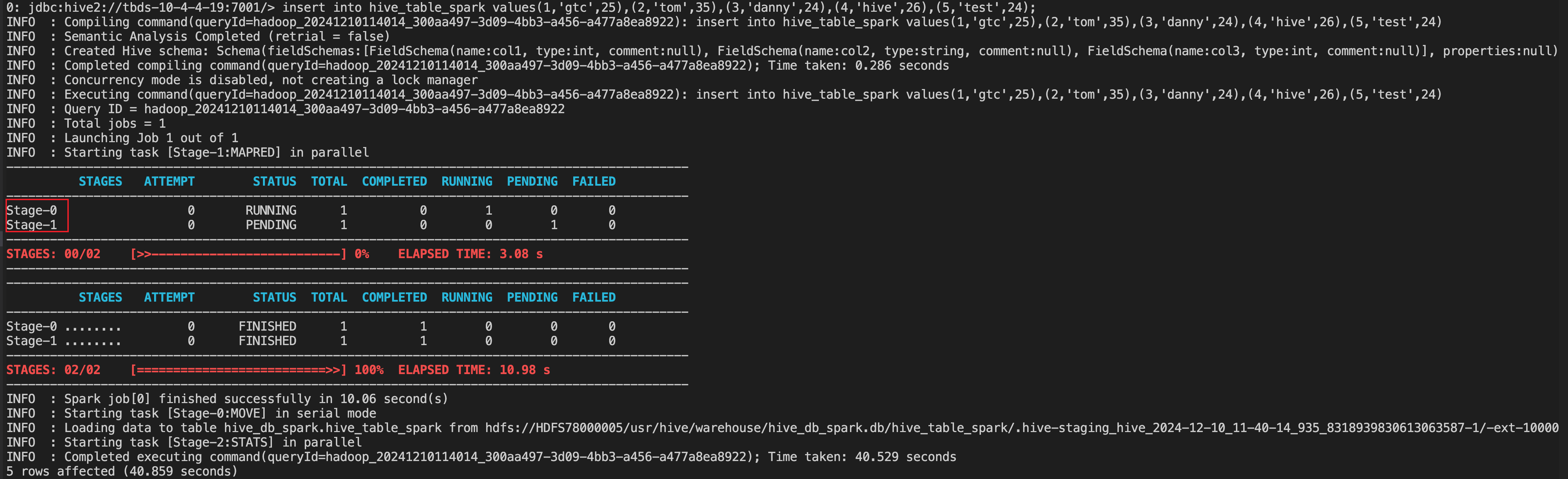 insert into hive_table_spark values(1,'gtc',25),(2,'tom',35),(3,'danny',24),(4,'hive',26),(5,'test',24);