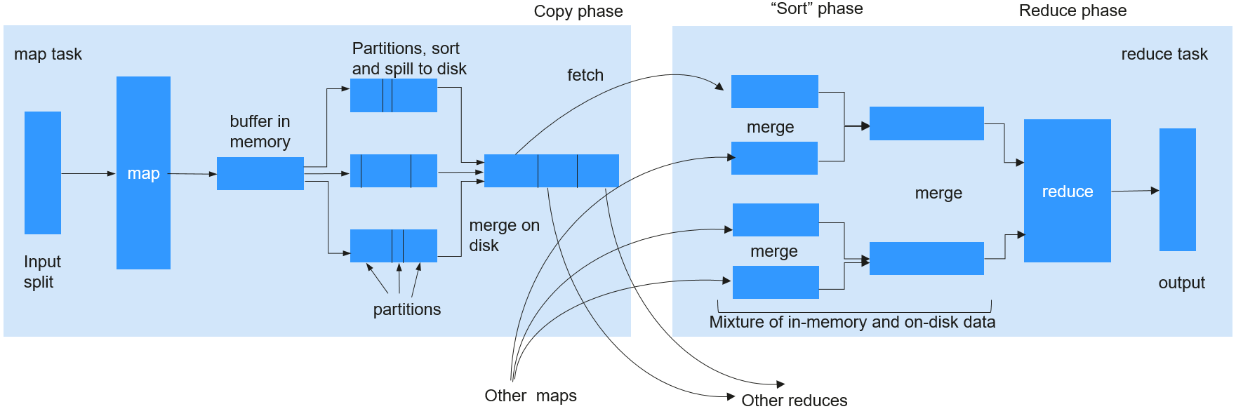 Reduce过程分为三个不同步骤:Copy、Sort(实际应当称为Merge)及Reduce。在Copy过程中,Reducer尝试从NodeManagers获取Maps的输出并存储在内存或硬盘中。紧接着进行Shuffle过程(包含Sort及Reduce),这个过程将获取到的Maps输出进行存储并有序地合并然后提供给Reducer。当Job有大量的Maps输出需要处理的时候,Shuffle过程将变得非常耗时。对于一些特定的任务(例如hash join或hash aggregation类型的SQL任务),Shuffle过程中的排序并非必需的。但是Shuffle却默认必须进行排序,所以需要对此处进行改进。