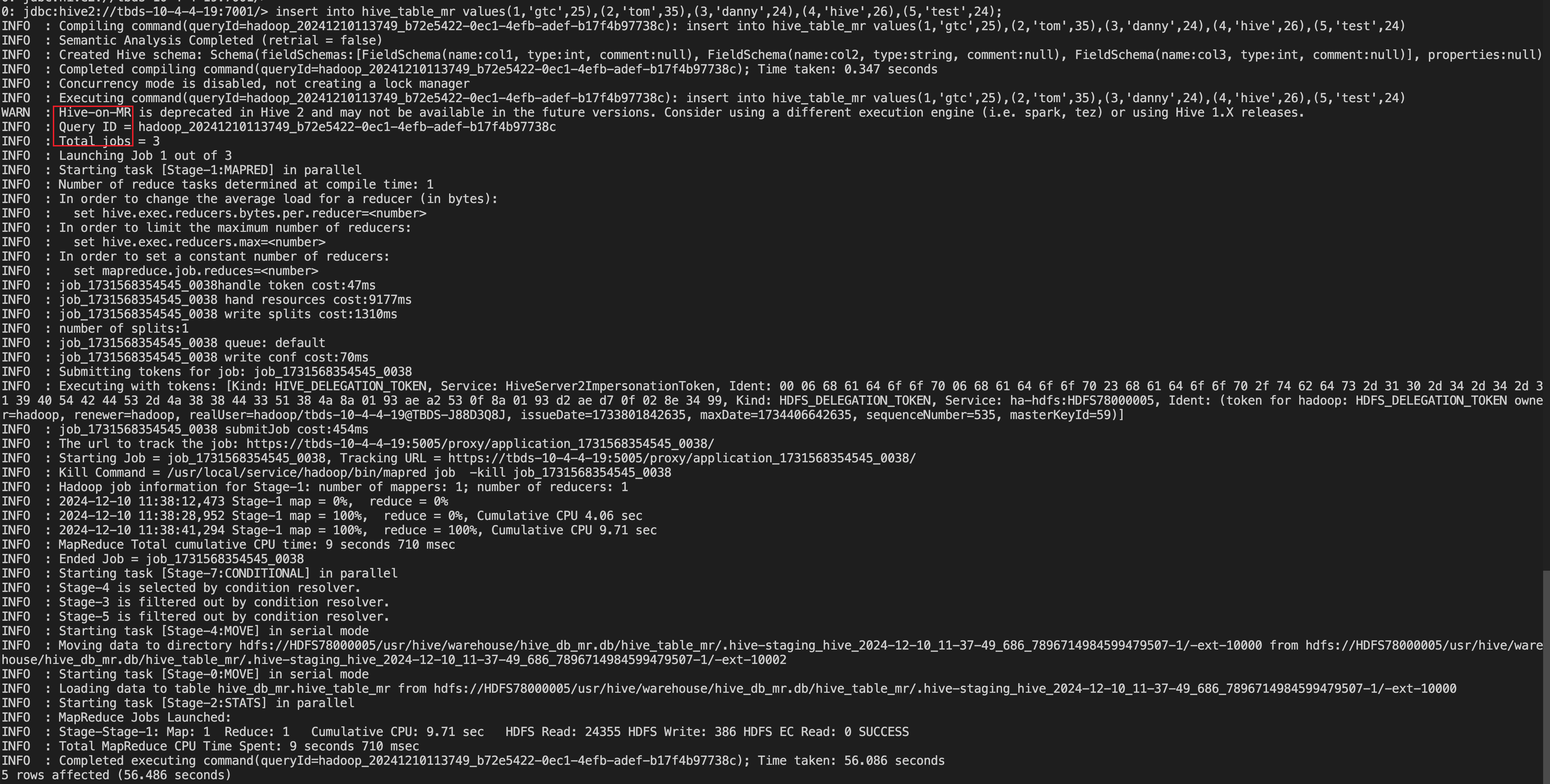 insert into hive_table_mr values(1,'gtc',25),(2,'tom',35),(3,'danny',24),(4,'hive',26),(5,'test',24);