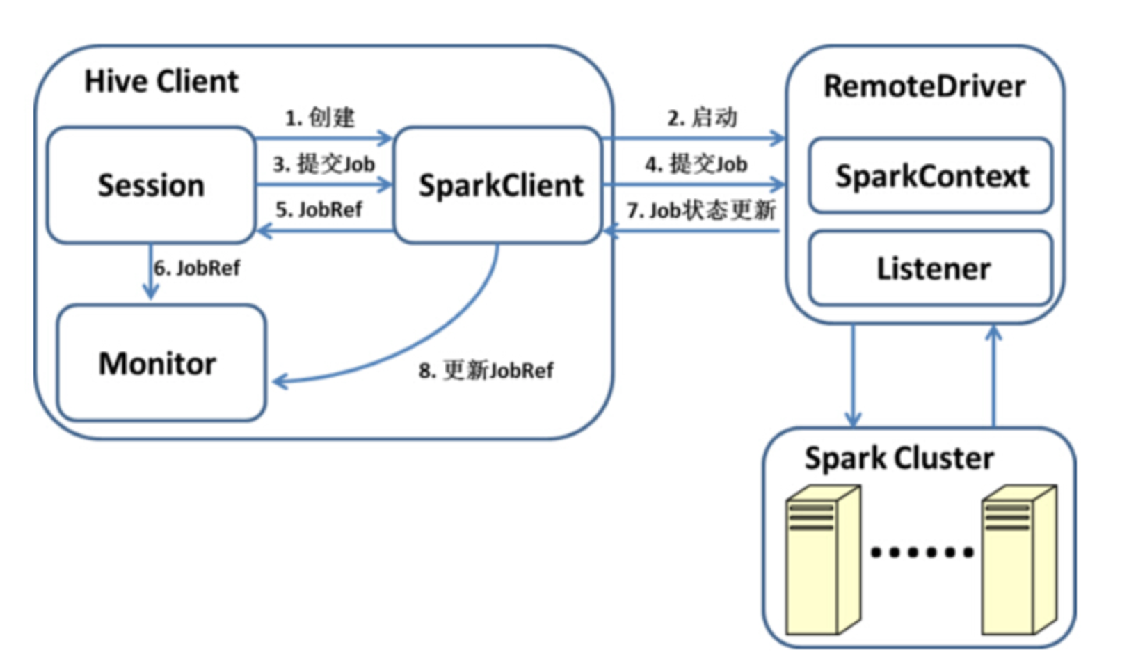 - SparkClient 将任务提交给RemoteDriver,并返回一个SparkJobRef,通过该SparkJobRef,客户端可以监控任务执行进度,进行错误处理, 以及采集统计信息等。由于最终的RDD计算没有返回结果,因此客户端只需要监控执行进度而不需要处理返回值。