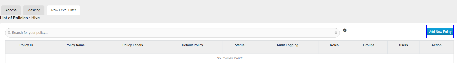 “Add New Policy”,添加行数据过滤策略。
