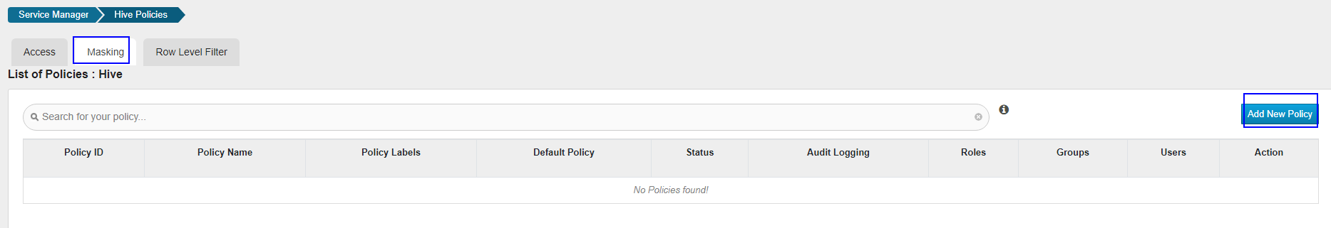在“Masking”页签单击“Add New Policy”,添加Hive权限控制策略。
