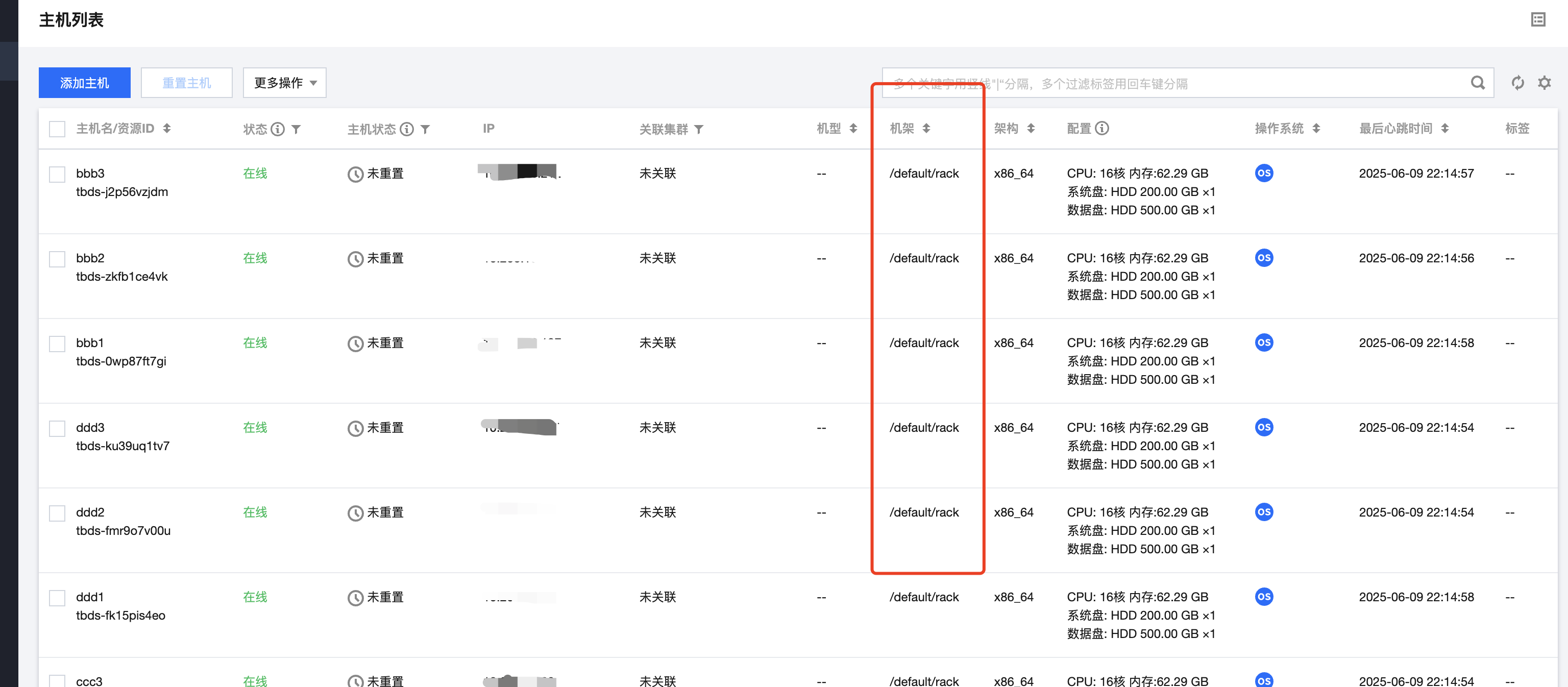 默认机架信息文件: /usr/local/service/rack/topology_map.py,无需后台修改,由TM管控页面的主机列表机架信息决定(具体设置方式参看主机运维章节)