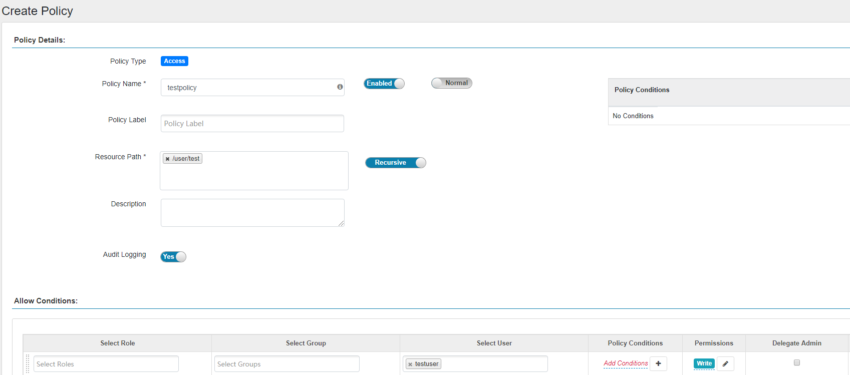 例如为用户“testuser”添加“/user/test”目录的写权限,配置如下:参数名称 描述 Policy Name 策略名称,可自定义,不能与本服务内其他策略名称重复。 Policy Conditions IP过滤策略,可自定义,配置当前策略适用的主机节点,可填写一个或多个IP或IP段,并且IP填写支持“*”通配符,例如:172.138.1.10,172.138.1.20或者172.138.1.*。 Policy Label 为当前策略指定一个标签,可以根据这些标签搜索报告和筛选策略。 Resource Path 资源路径,配置当前策略适用的HDFS路径文件夹或文件,可填写多个值,支持使用通配符“*”(例如“/test/*”)。