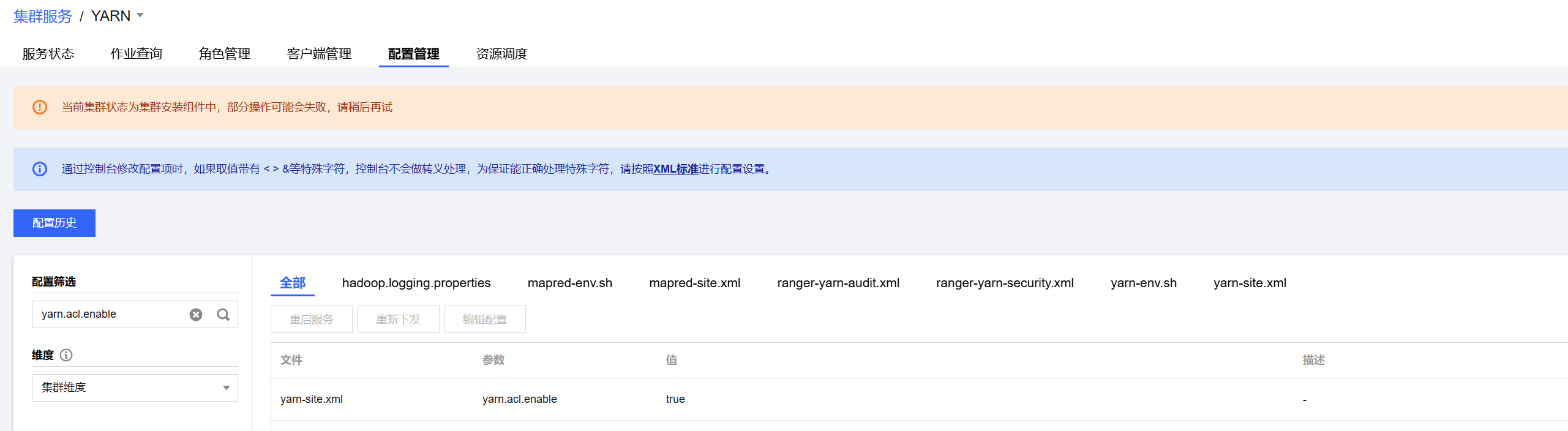 - 进入“配置管理”页,搜索参数“yarn.acl.enable”,修改参数值为“true”。如果该参数值已经为“true”,则无需处理。