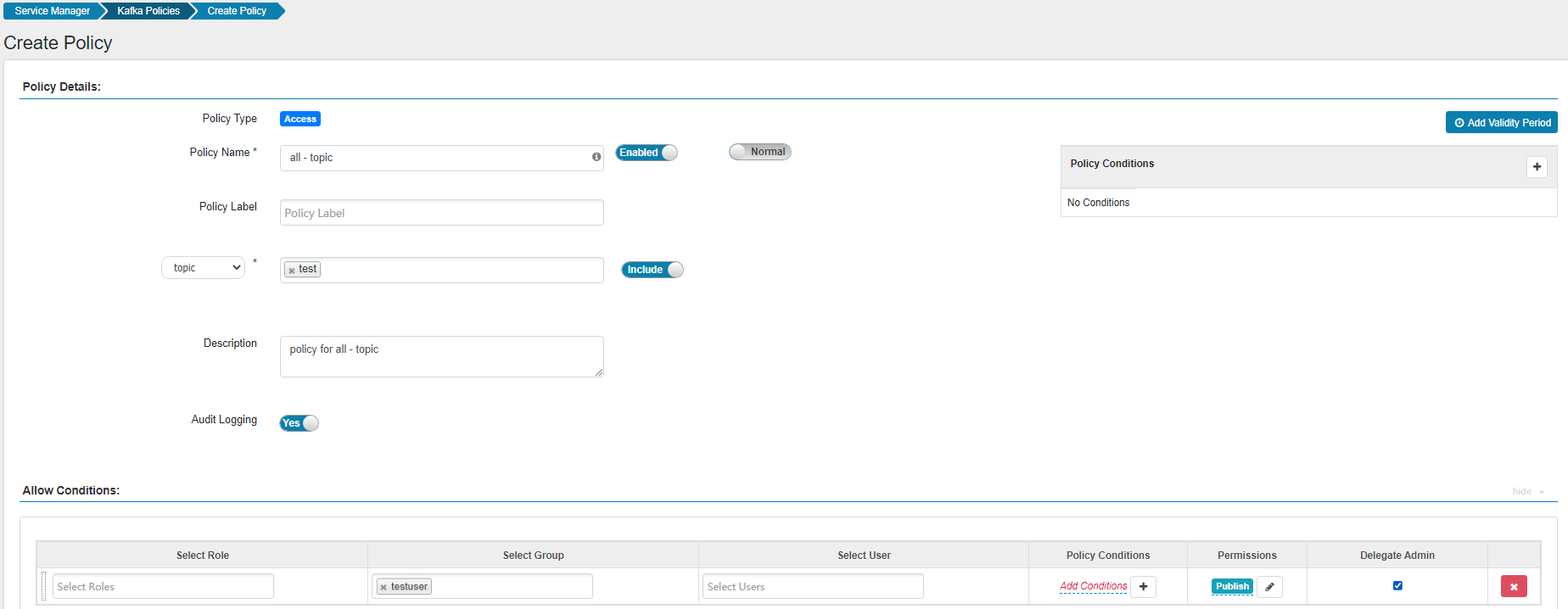 - 单击“Add New Policy”,添加Kafka权限控制策略。