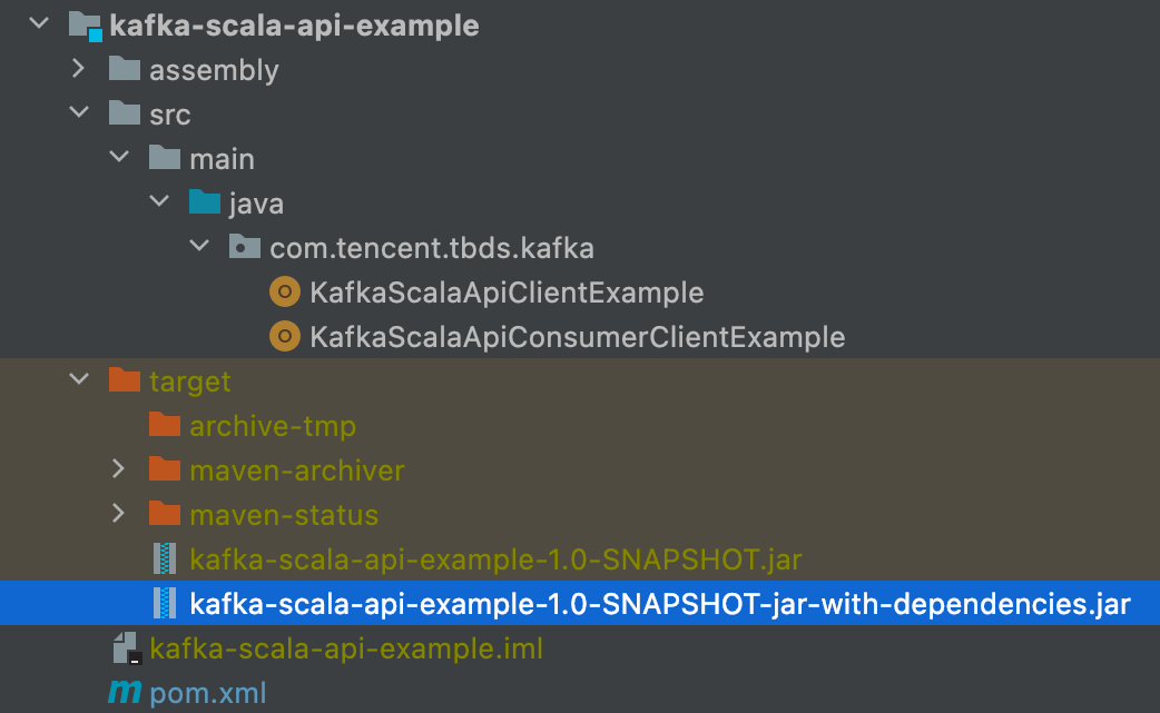 //参考示例工程 kafka-examples/kafka-scala-api-example 打包出 kafka-scala-api-example-1.0-SNAPSHOT-jar-with-dependencies.jar