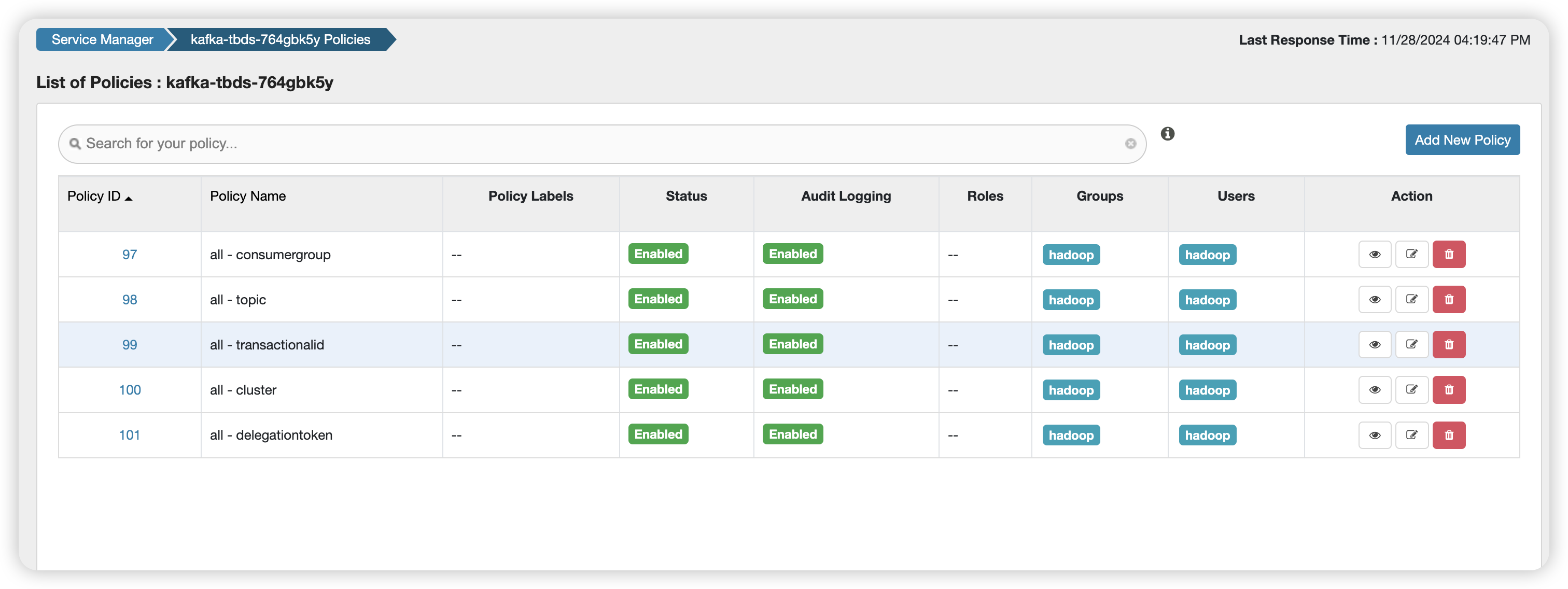 登录RangerUI可以管理Kafka组件的ACL,新增/修改/删除相关的Kafka topic权限信息(具体使用方式请参考Ranger授权):