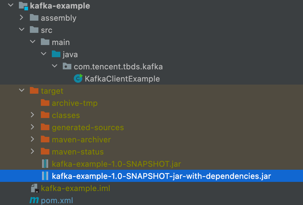 //参考示例工程 kafka-examples/kafka-example 打包出 kafka-example-1.0-SNAPSHOT-jar-with-dependencies.jar