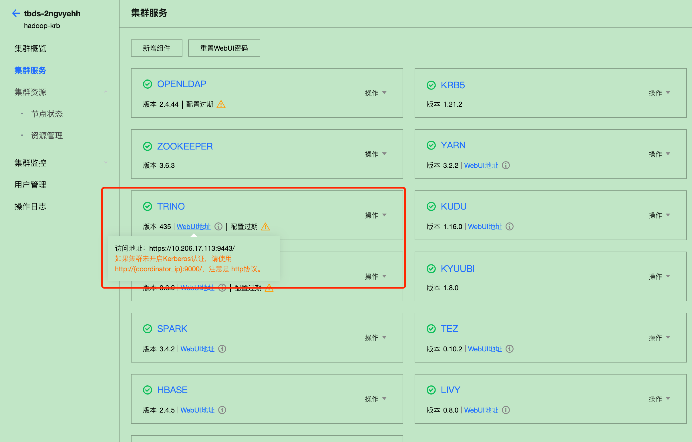 登录TBDS Manager 管控平台,点击“集群列表”,选择 Trino 程序运行所对应的集群。点击“集群服务”,选择 TRINO 服务,点击 WebUI 地址跳转至 Web UI 界面。
