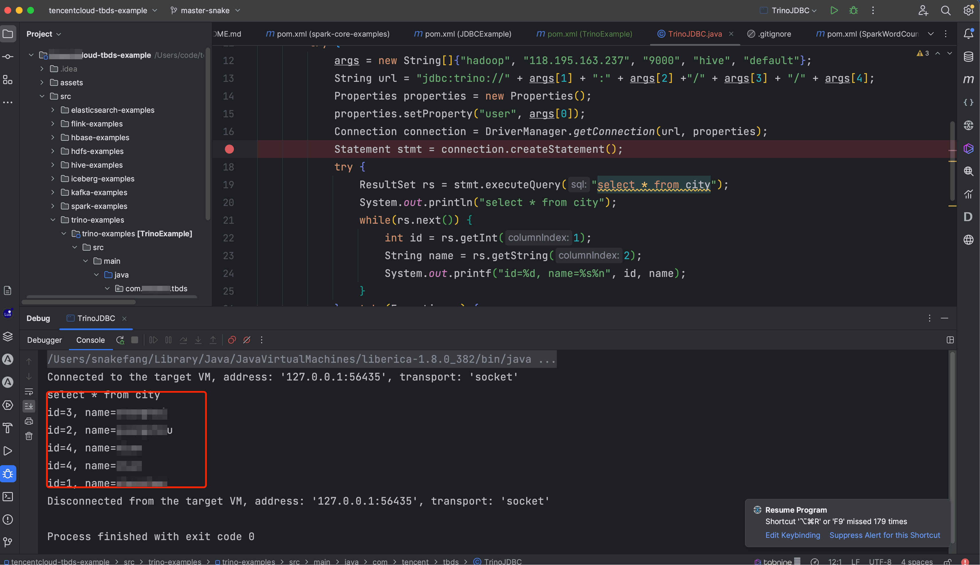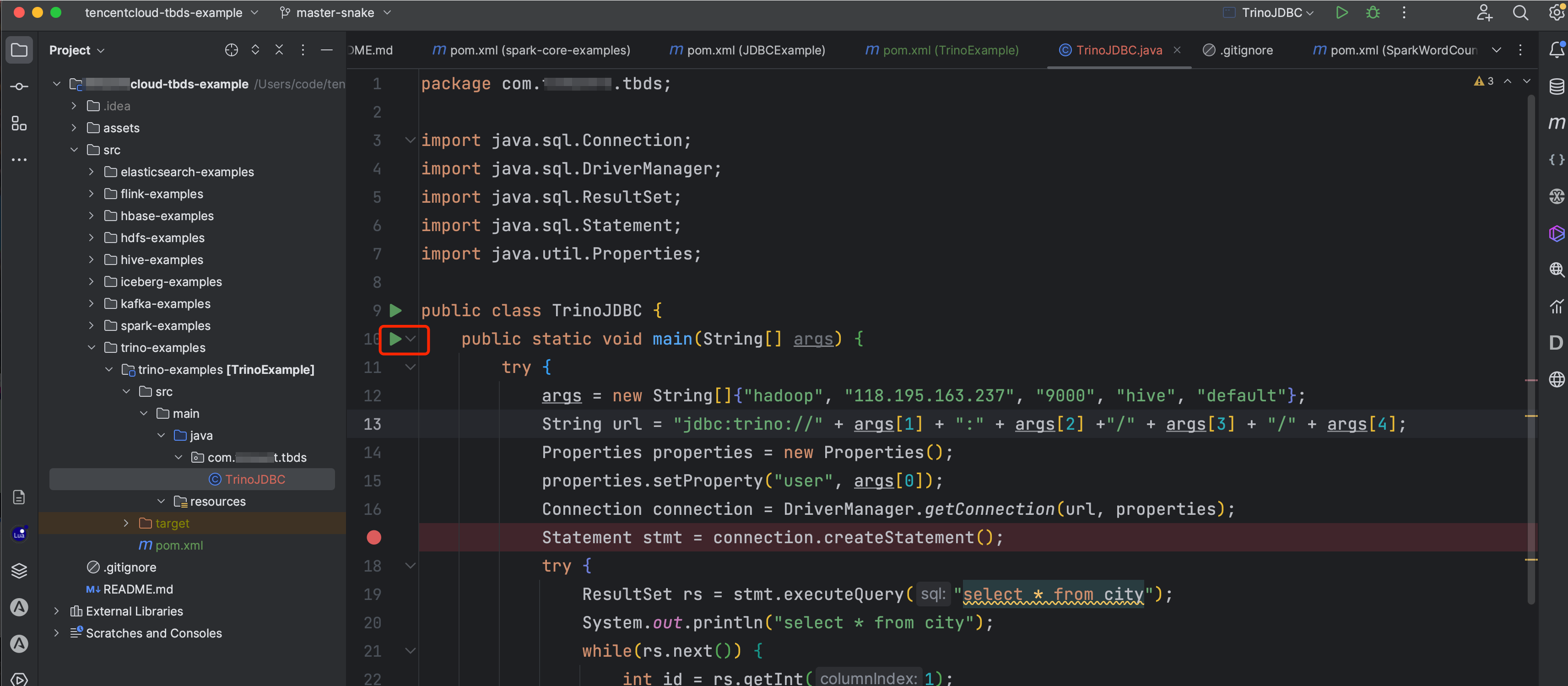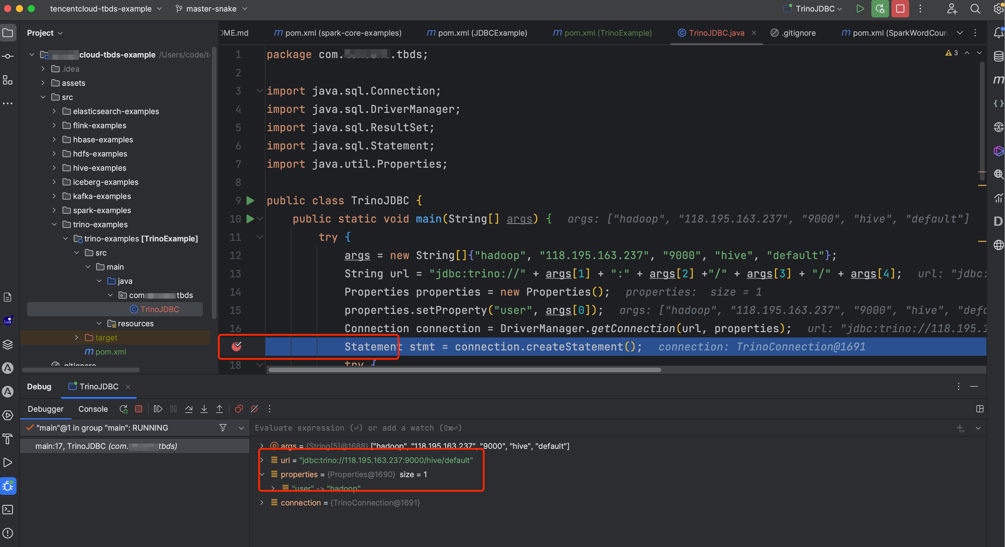 使用idea并配置好环境之后,即可进行调试,需要注意的是,保证开发环境和Trino组件的网络互通,如果网络不互通,将代码打包之后上传到作业机,使用Java -jar TrinoExample-1.0-SNAPSHOT-jar-with-dependencies.jar 运行代码,注意,需要在pom.xml中标注mainClass。