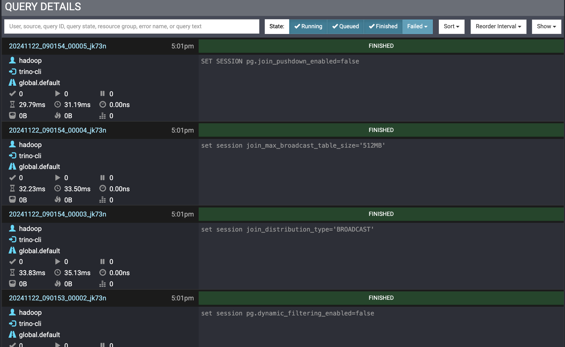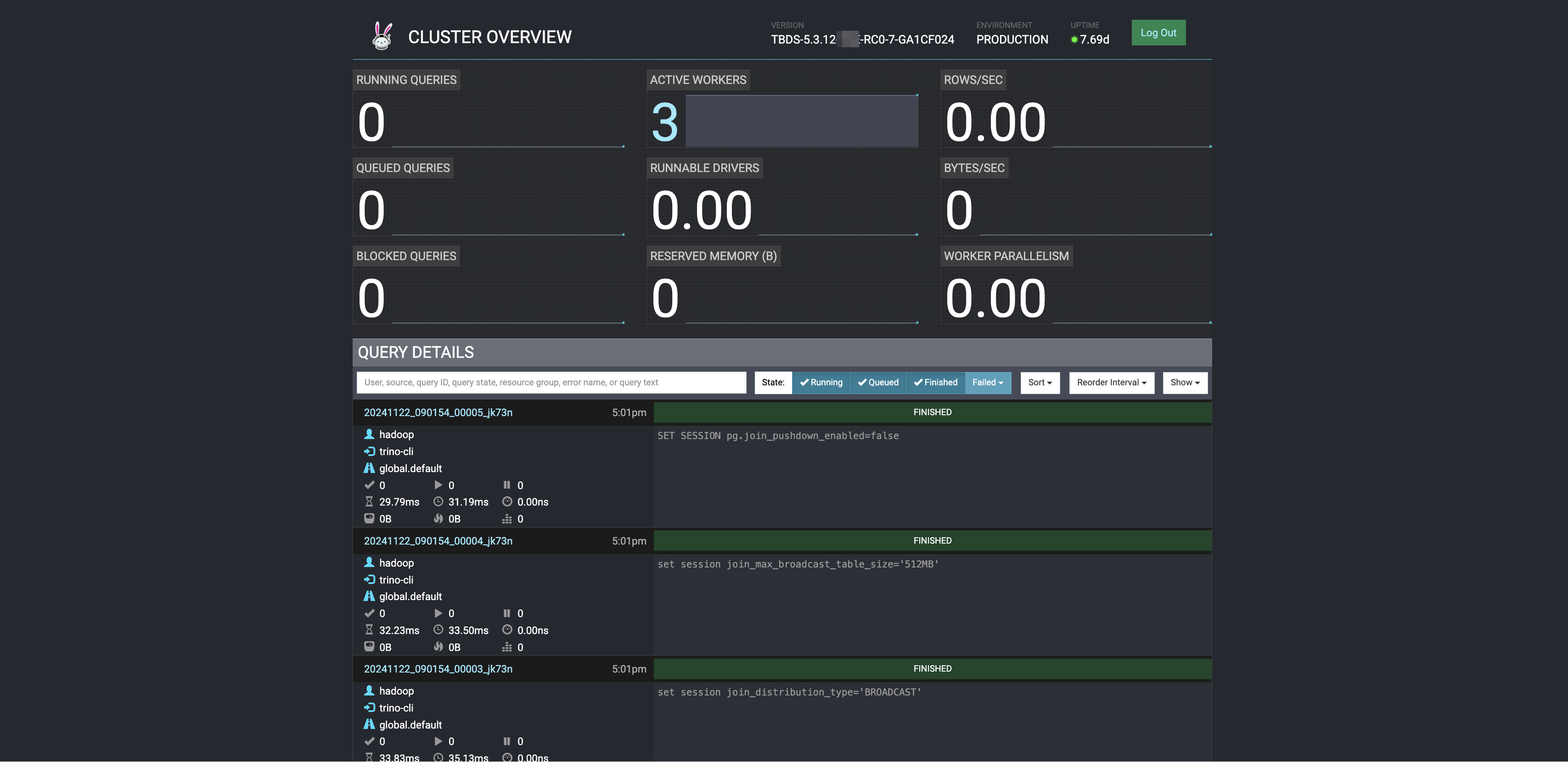 Trino只会保存最近的不超过200条的查询,可调整query.max-history配置(默认为100)以增加保存的SQL数量。