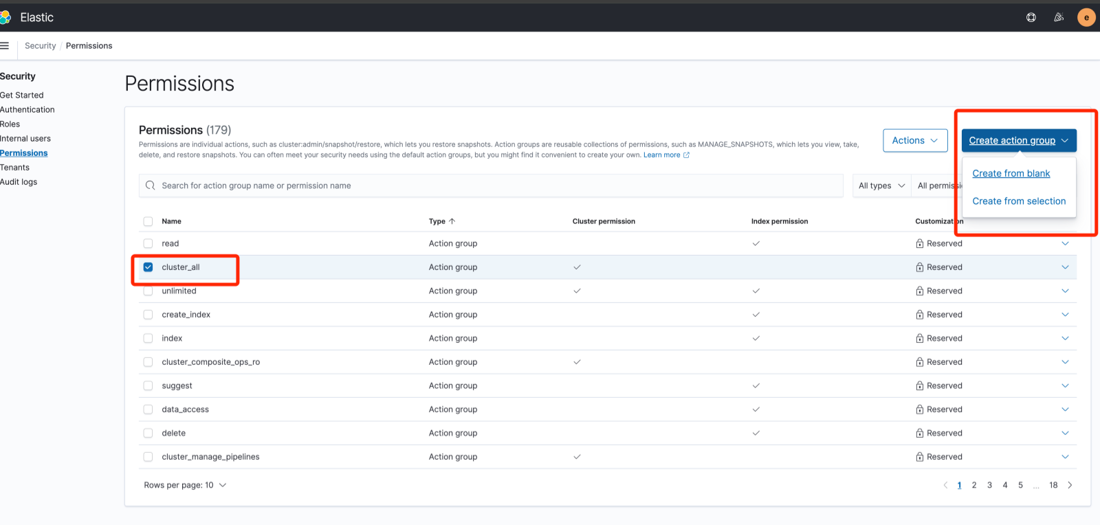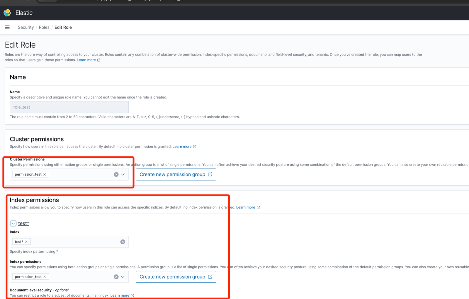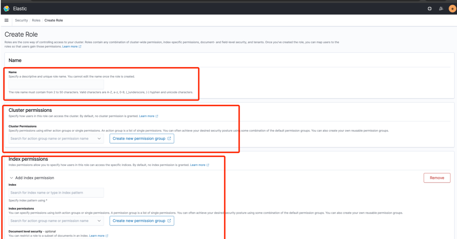 - 配置角色,分别为角色创建对应的名称, 分配集群权限, 分配索引权限。
