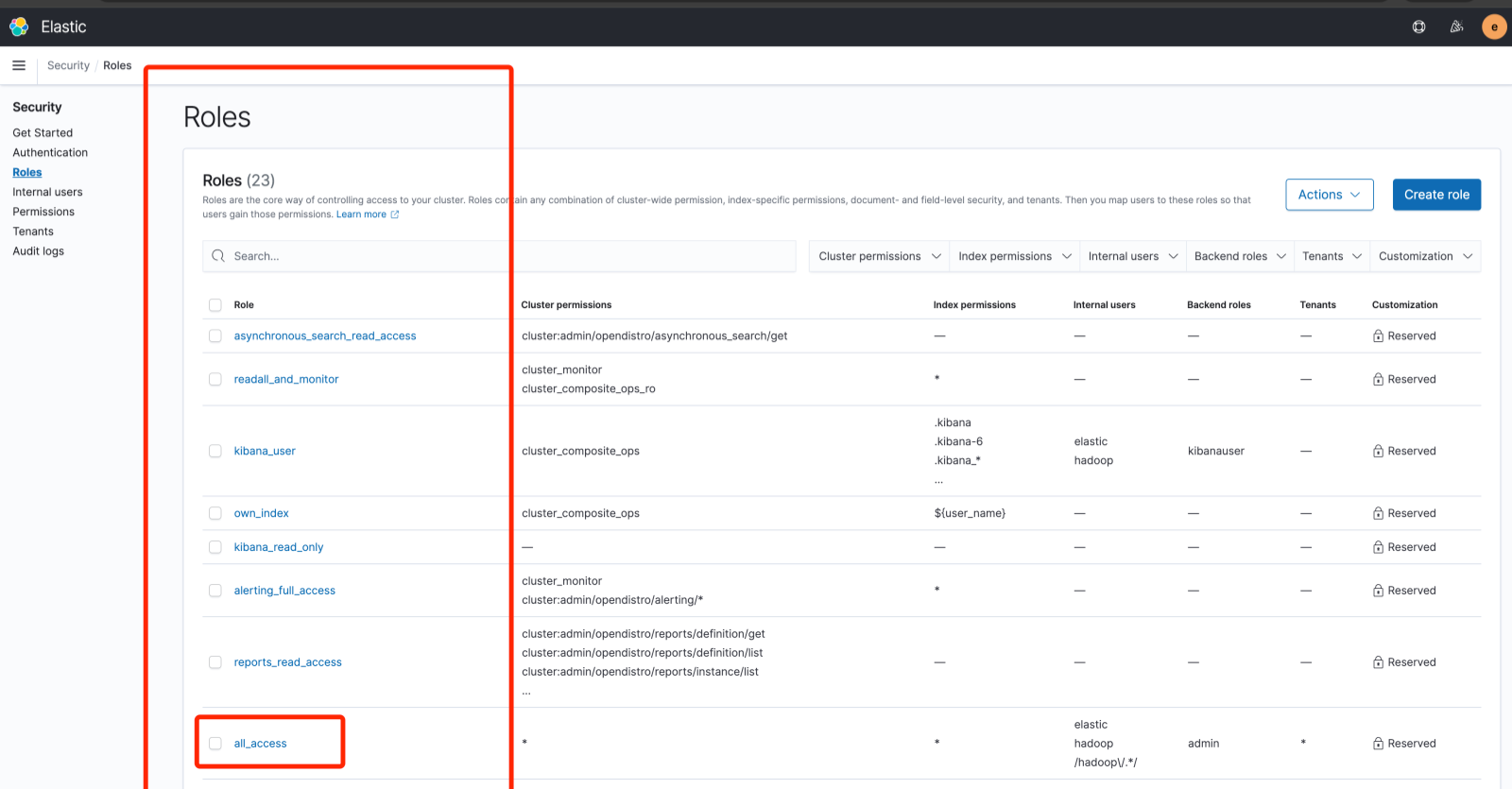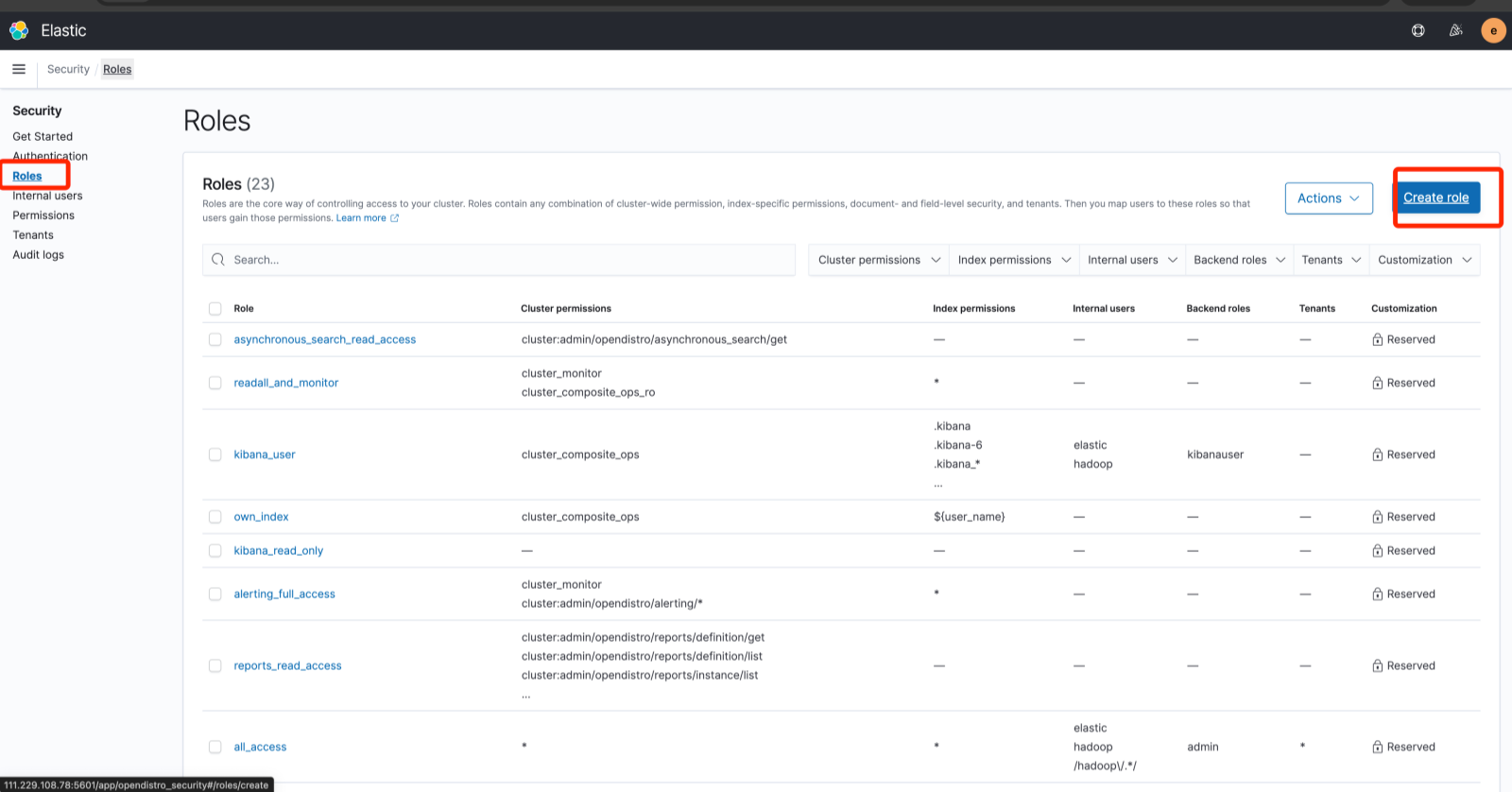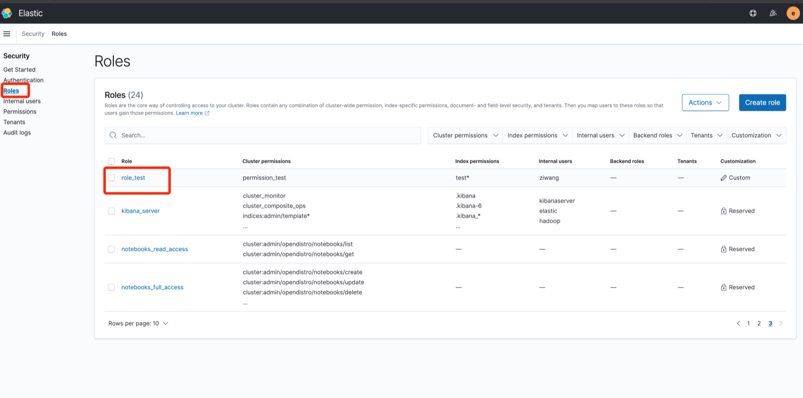 在页面创建用户后, 或者在 TBDS 平台中创建的用户默认在 ES 集群中是没有权限的, 需要参考如下步骤配置用户的角色。在 Roles 页面, 选择对应的角色赋予给用户。